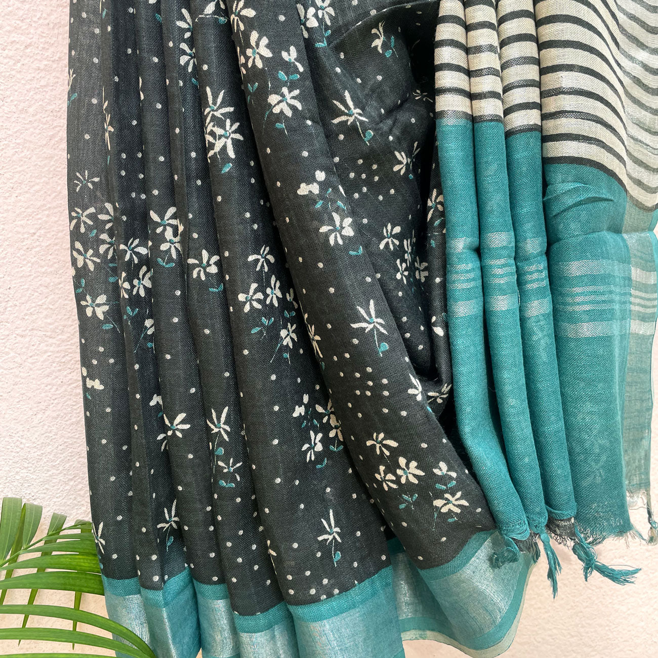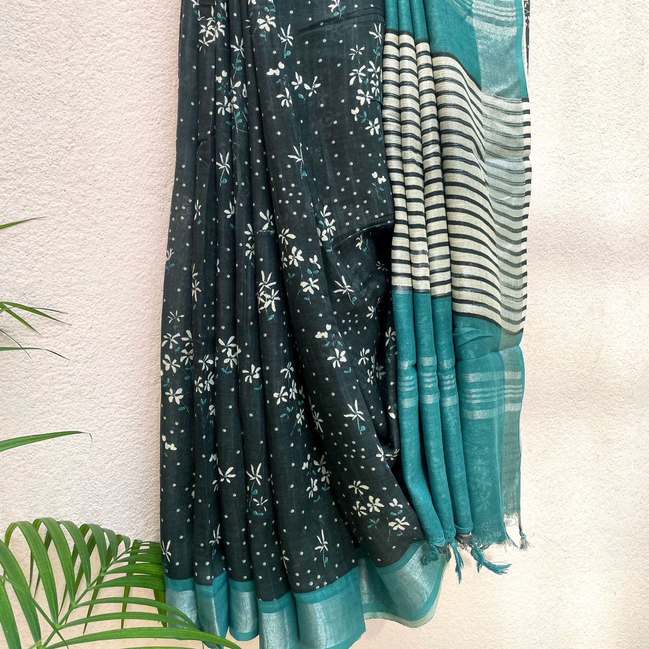 Keep winning with the Midnight Glory organic linen saree from our Guzaarish collection.