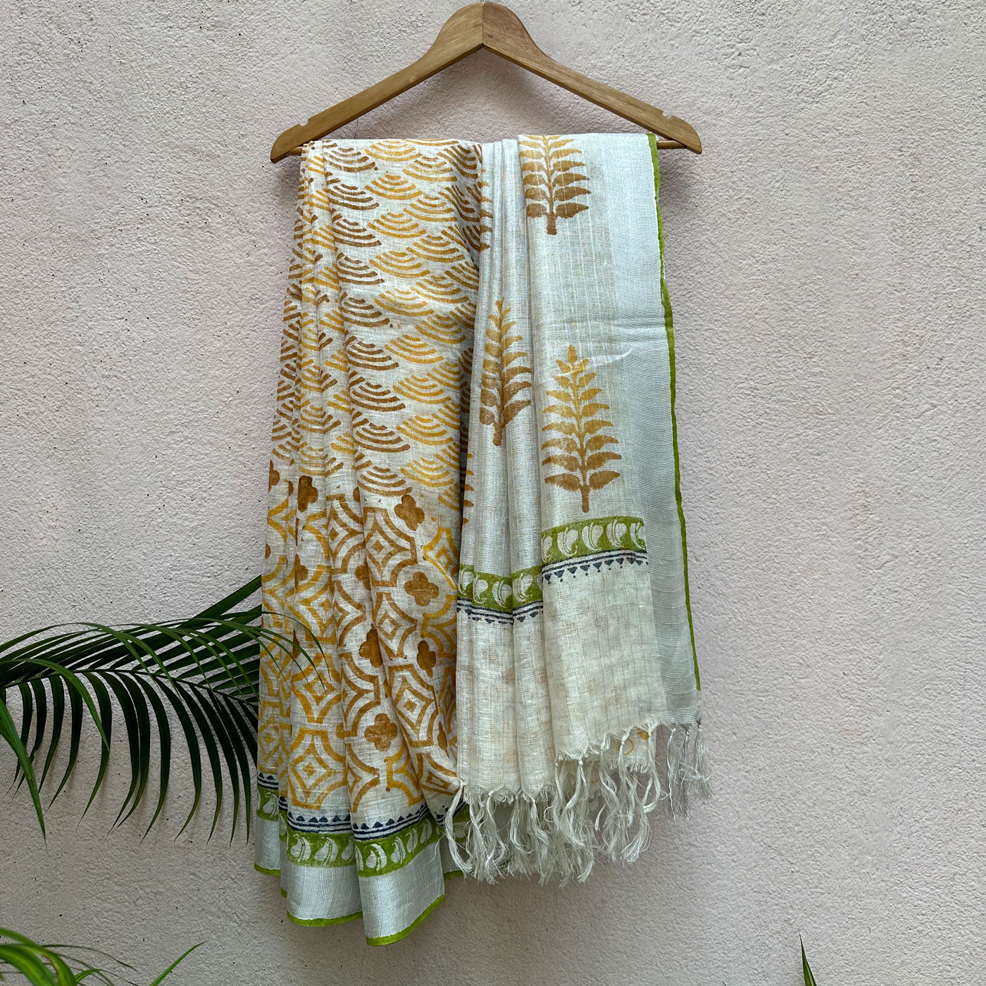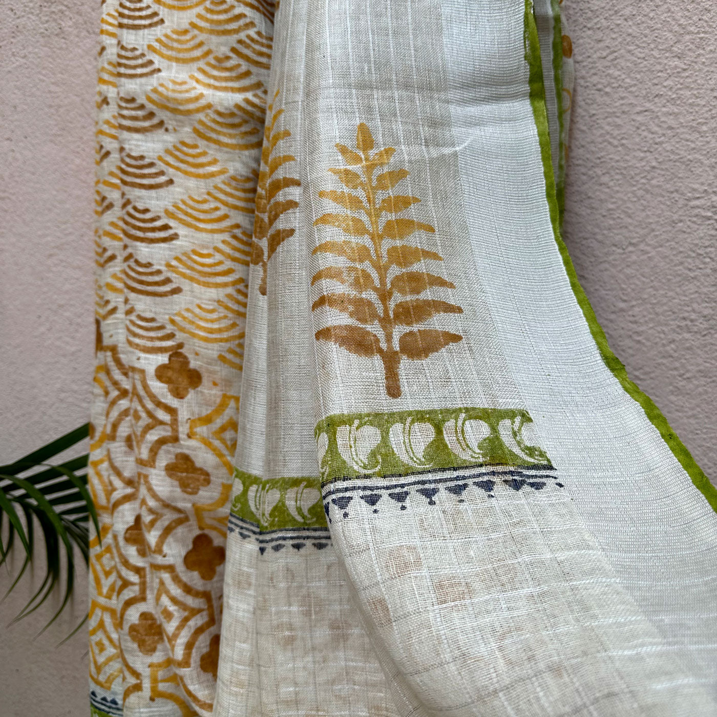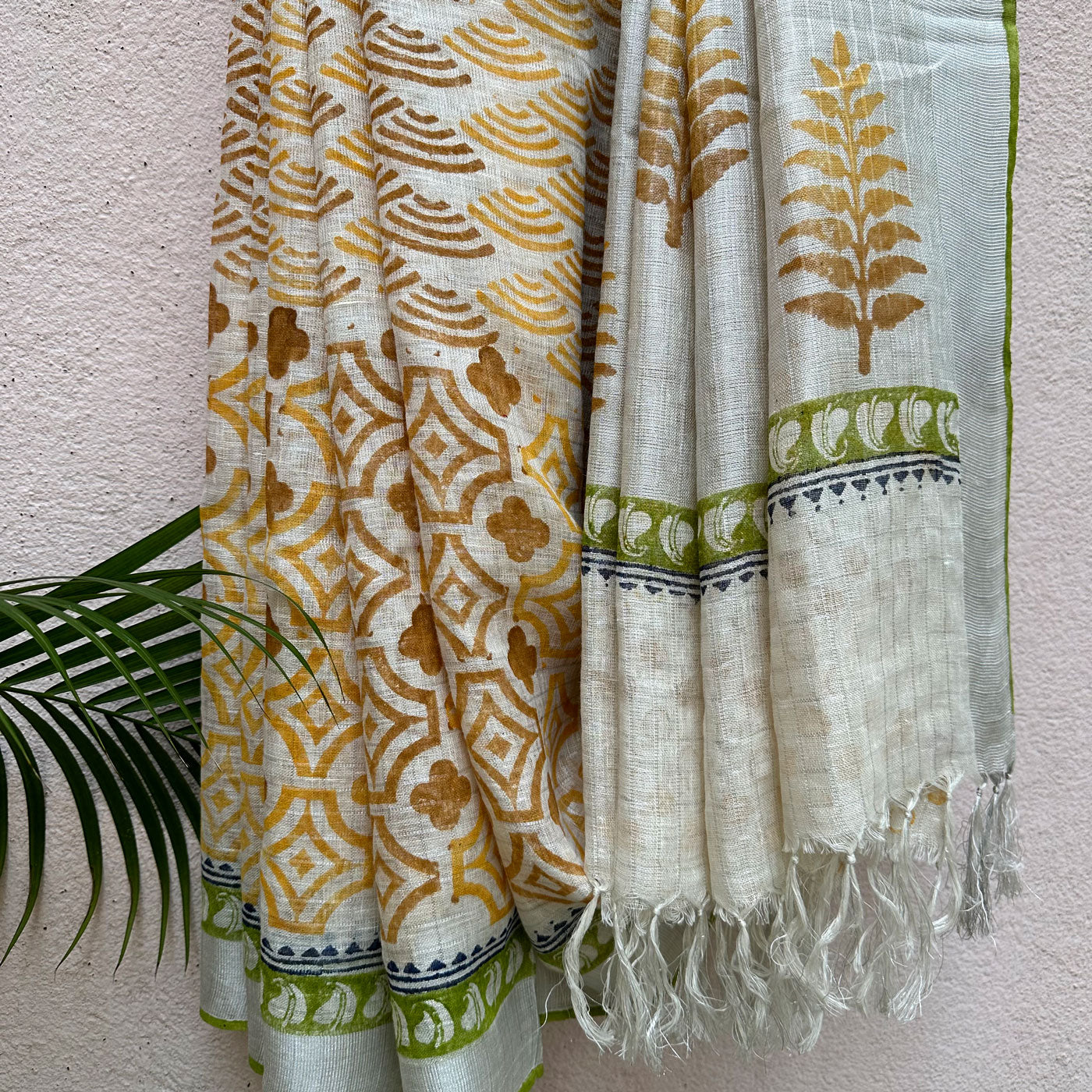 Experience sophistication in our collection of handblock-printed pure linen sarees.