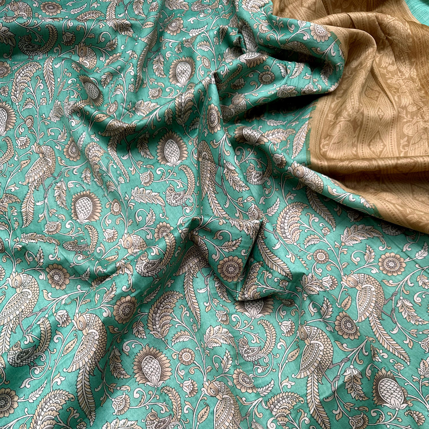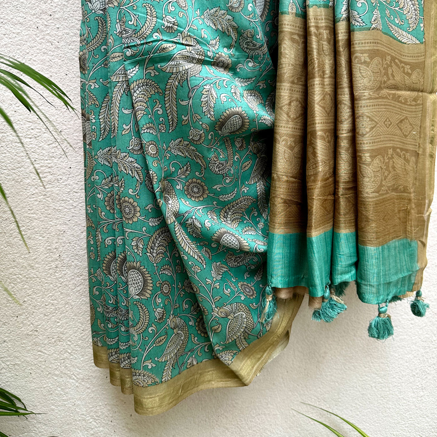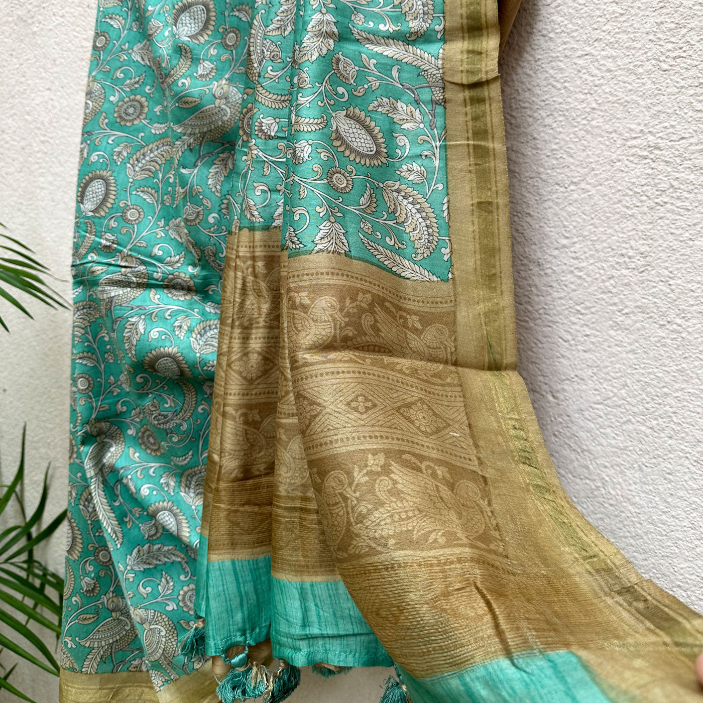 Indulge in a fearless and daring nature with this luxurious chanderi silk, exuding an intricate allure with its Chintz print of dancing peacock and florals against a striking teal Blue backdrop. The bright beige pallu and border add a pop of vibrant color, elevating it to the perfect choice for weddings or festive occasions. The matching tassels adds an additional charm. Combining time-honored techniques with a modern twist, this piece guarantees an elegant and daring presence.