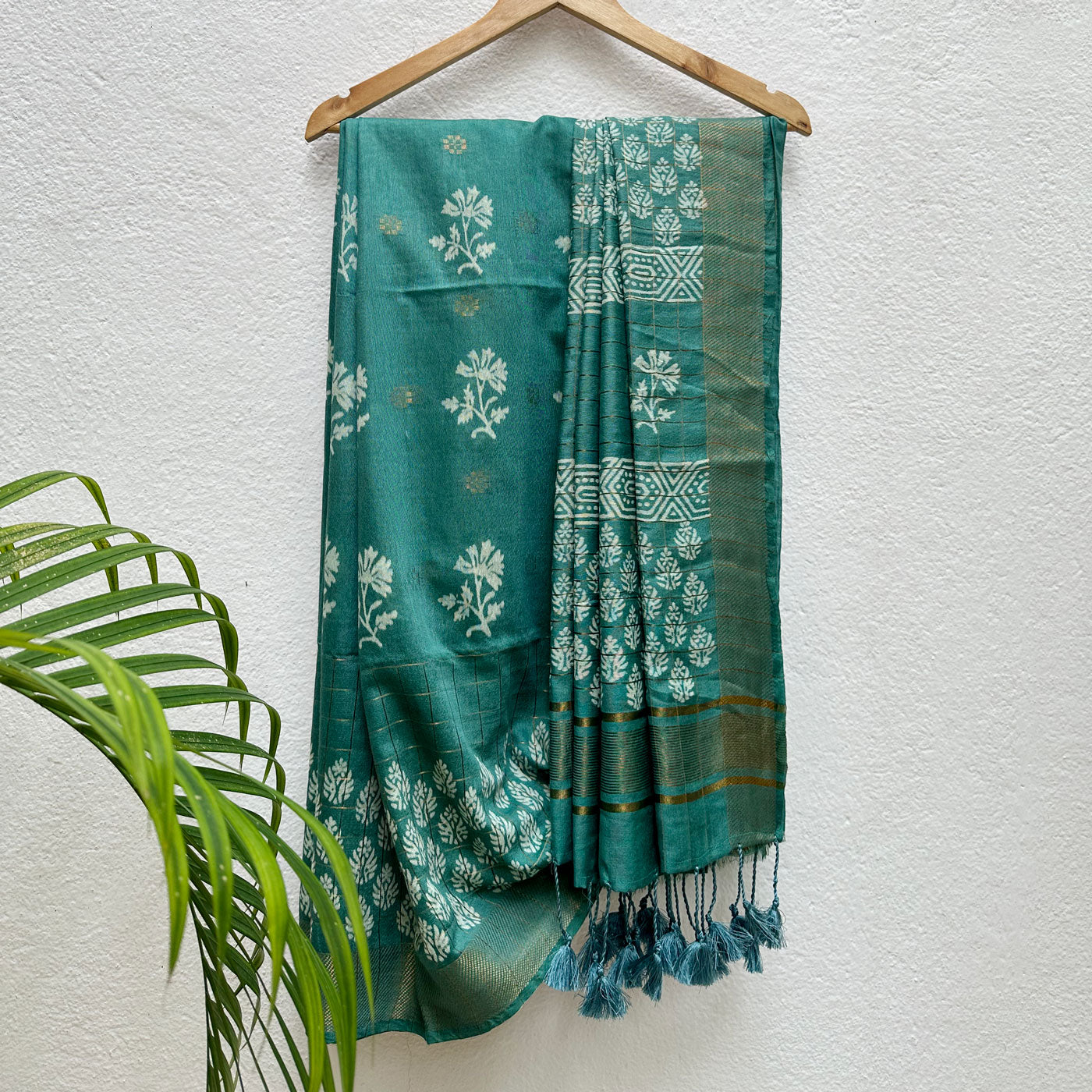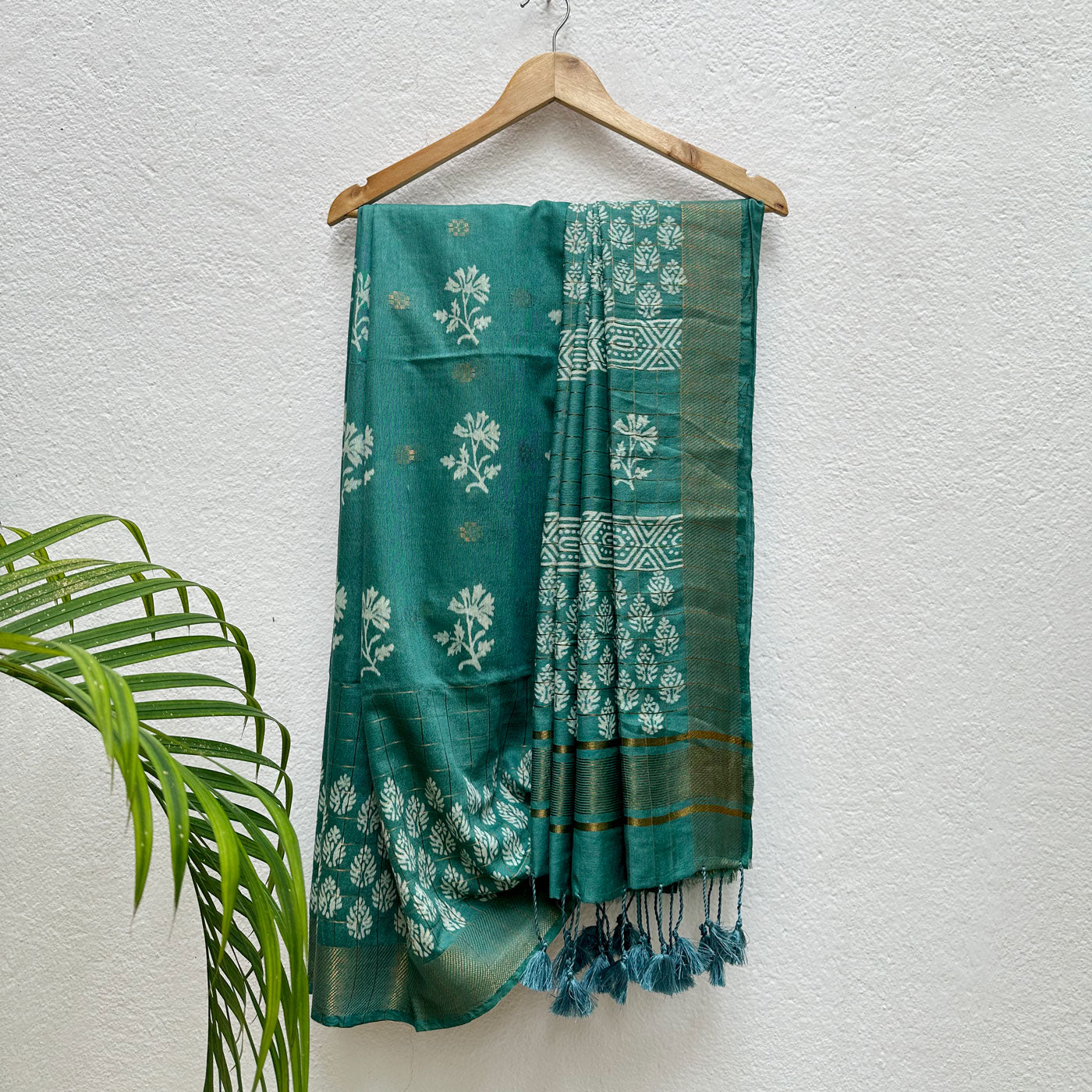 Ignite your wardrobe with this striking cotton-silk saree, featuring a bold gold stripe border highlighted by a dynamic handblock chevron pattern. The daring tassels on the pallu add an edgy vibe, while the handblock motifs, gold butas, and checks pattern across the saree radiate a fearless blend of timeless and spirited charm. Crafted to elevate your confidence and command attention, this saree is your go-to for making a powerful and stylish statement at any occasion.