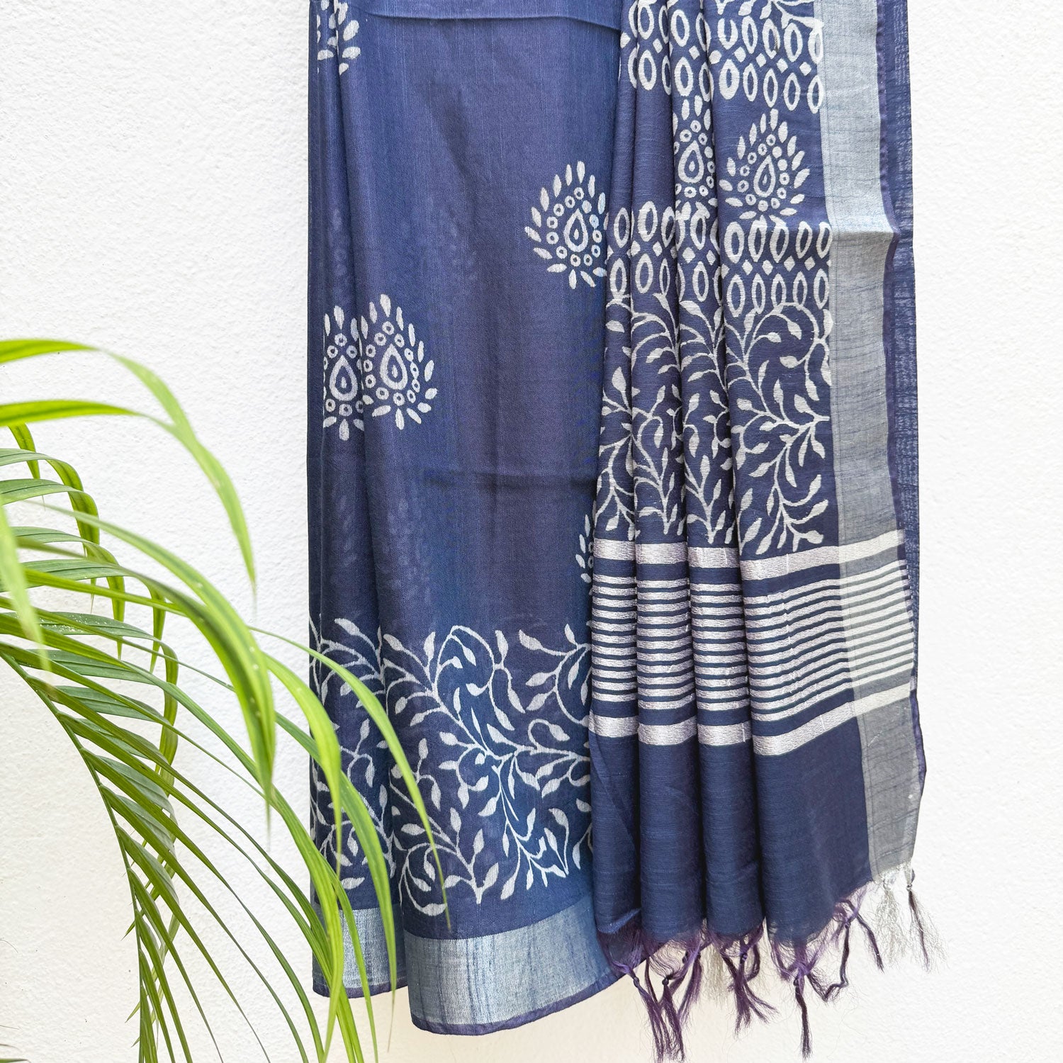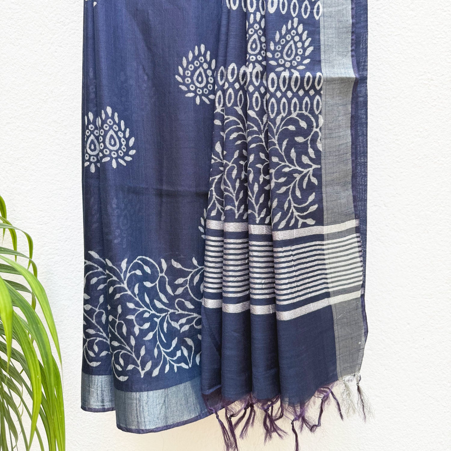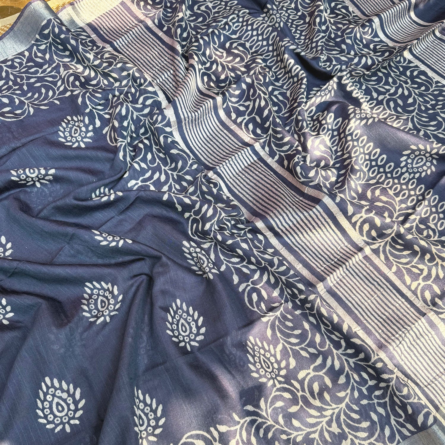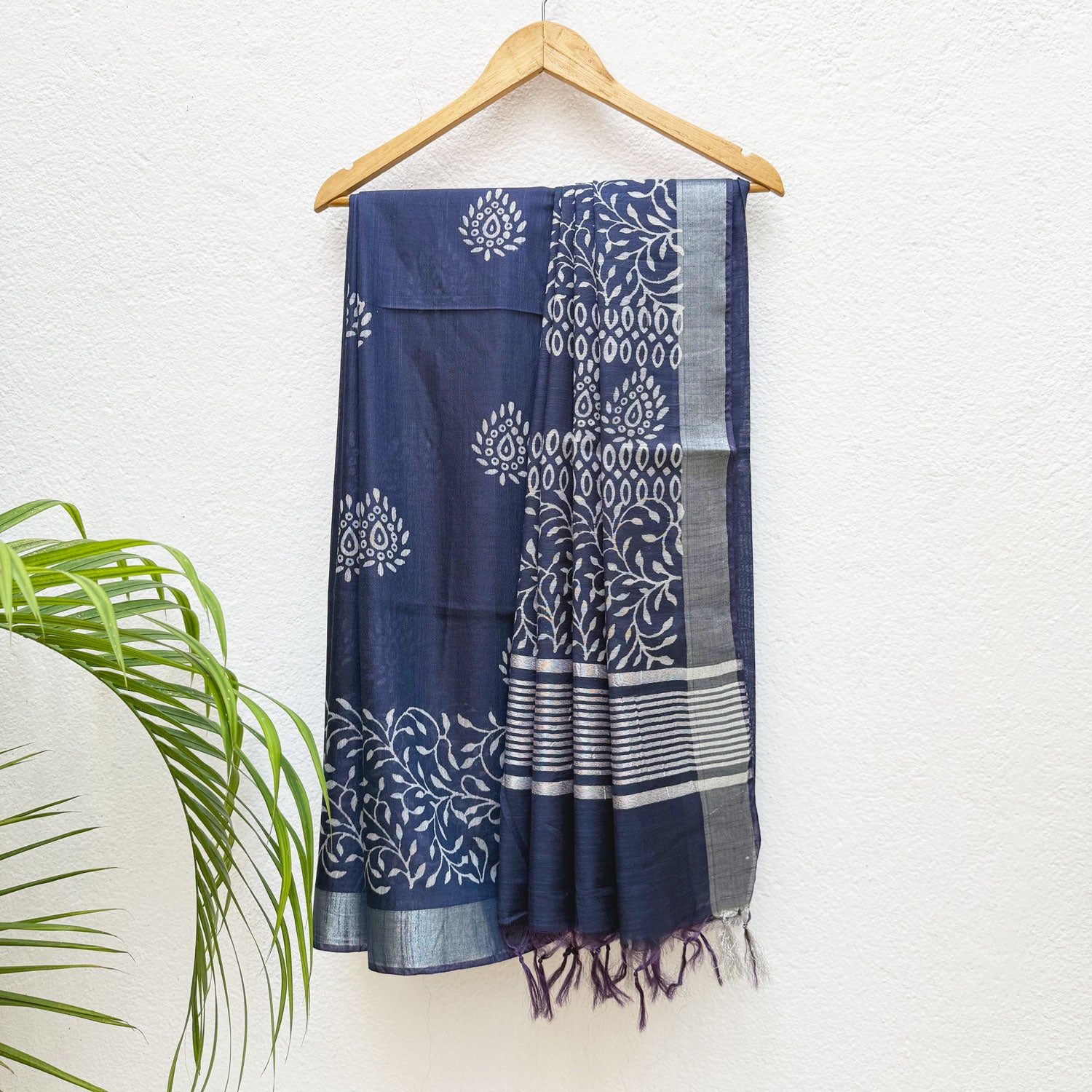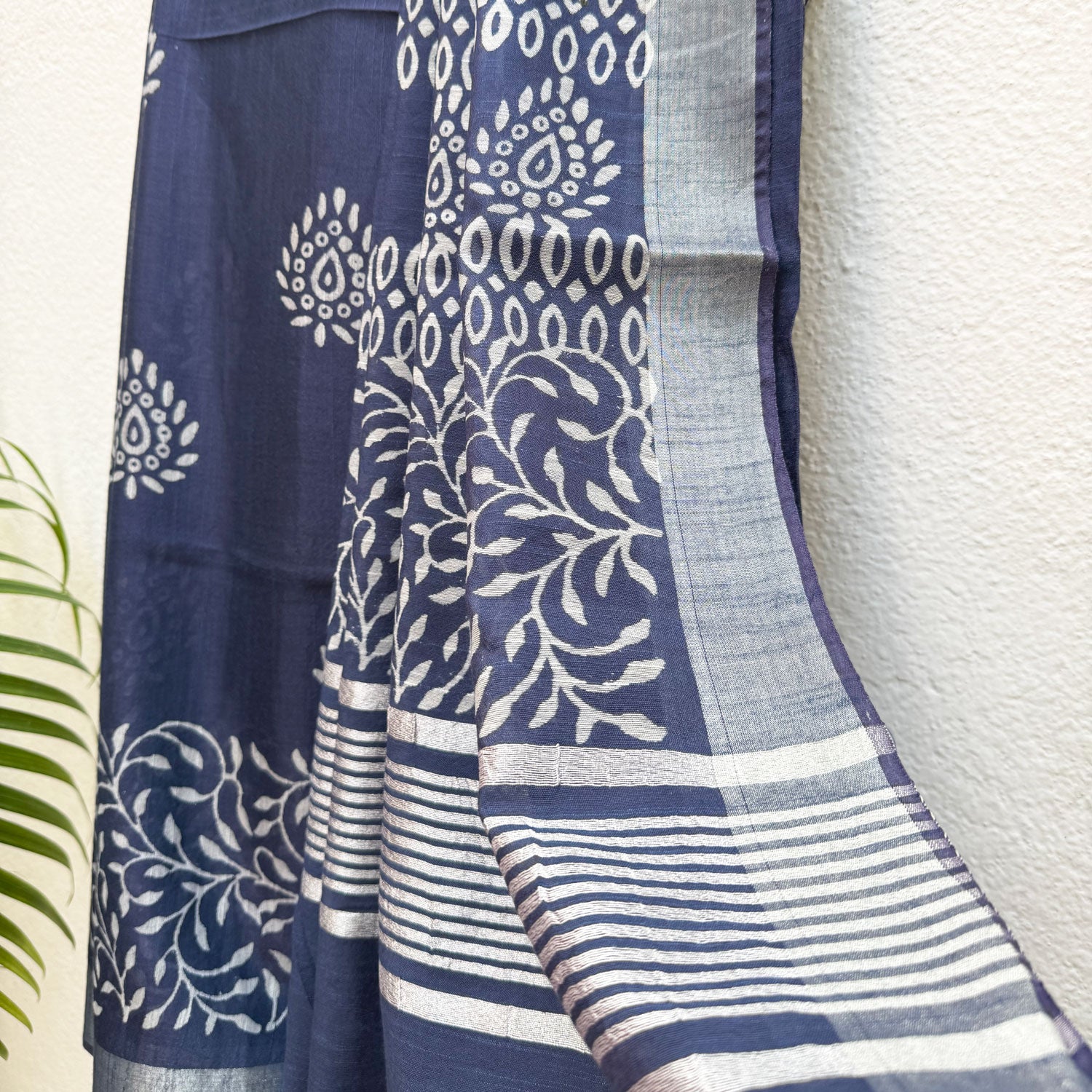 Elevate your wardrobe with this exquisite hand block print saree. The intricate Paisley buta design adds a touch of sophistication to the entire body while the beautiful floral pattern on the border provides an elegant complement. The pallu boasts a complementary design and zari border to complete the luxurious and refined look.