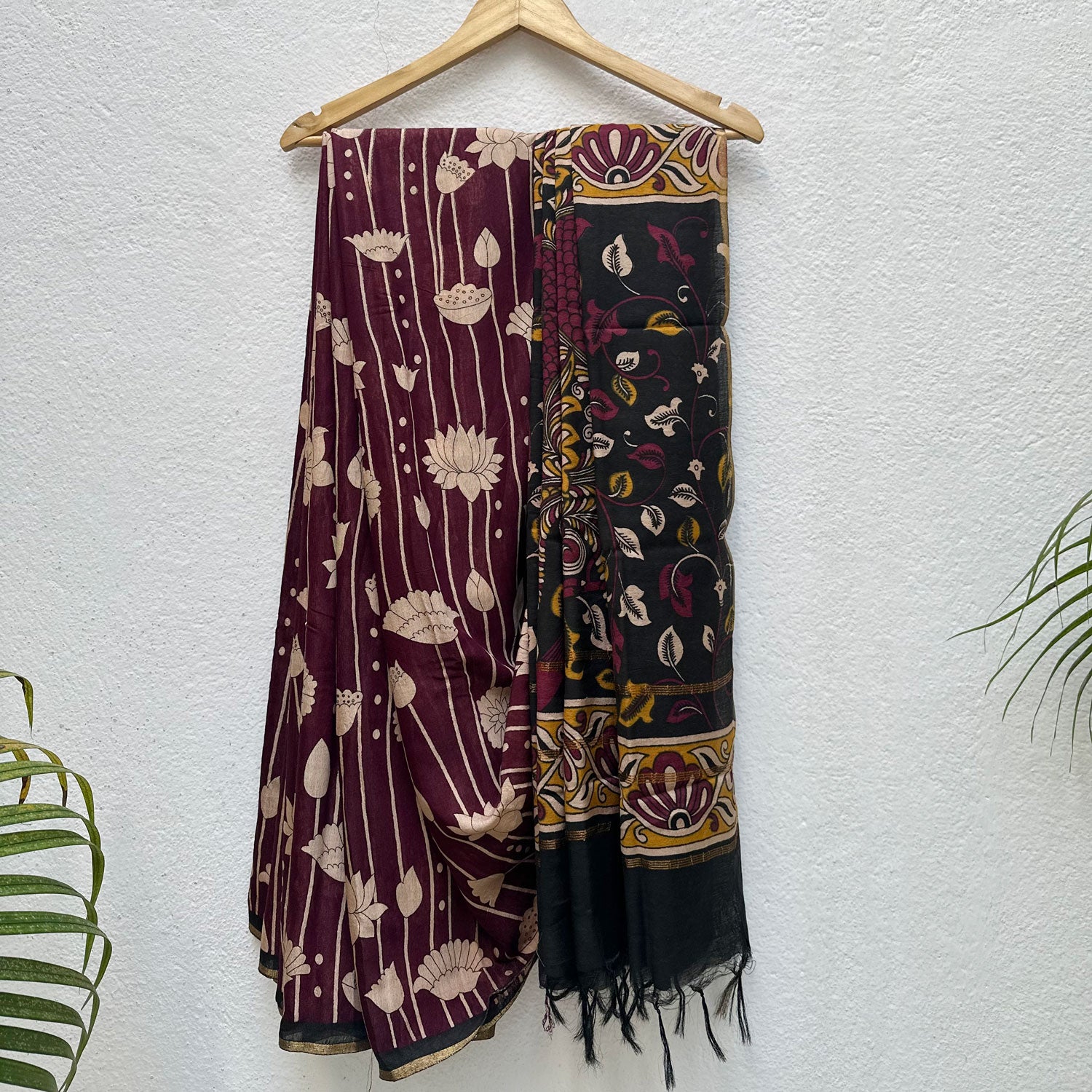 Elevate your festive wardrobe with the Padma Pichwai Cotton Silk Printed Saree—a bold fusion of tradition and contemporary flair. Inspired by timeless temple art, Padma features delicate Pichwai motifs printed on a cotton-silk blend that adds a soft festive glow. This stunning piece features rich maroon tones adorned with Pichwai pattern artistry, paired with a a thin contrasting black and gold zari border that catches every light. The pichwai pattern body dances with the artfully contrasting kalamkari pallu adding unexpected personality and drama. Crafted from a luxurious cotton-silk blend, it drapes beautifully and moves with effortless grace. A saree made for haldi ceremonies, morning weddings, and trousseau styling.