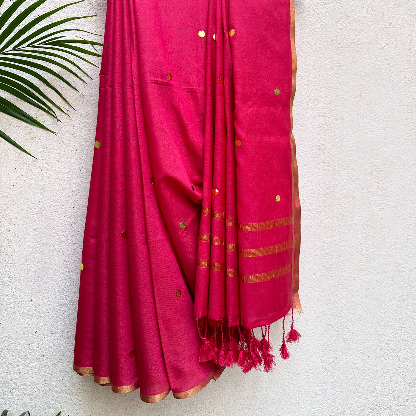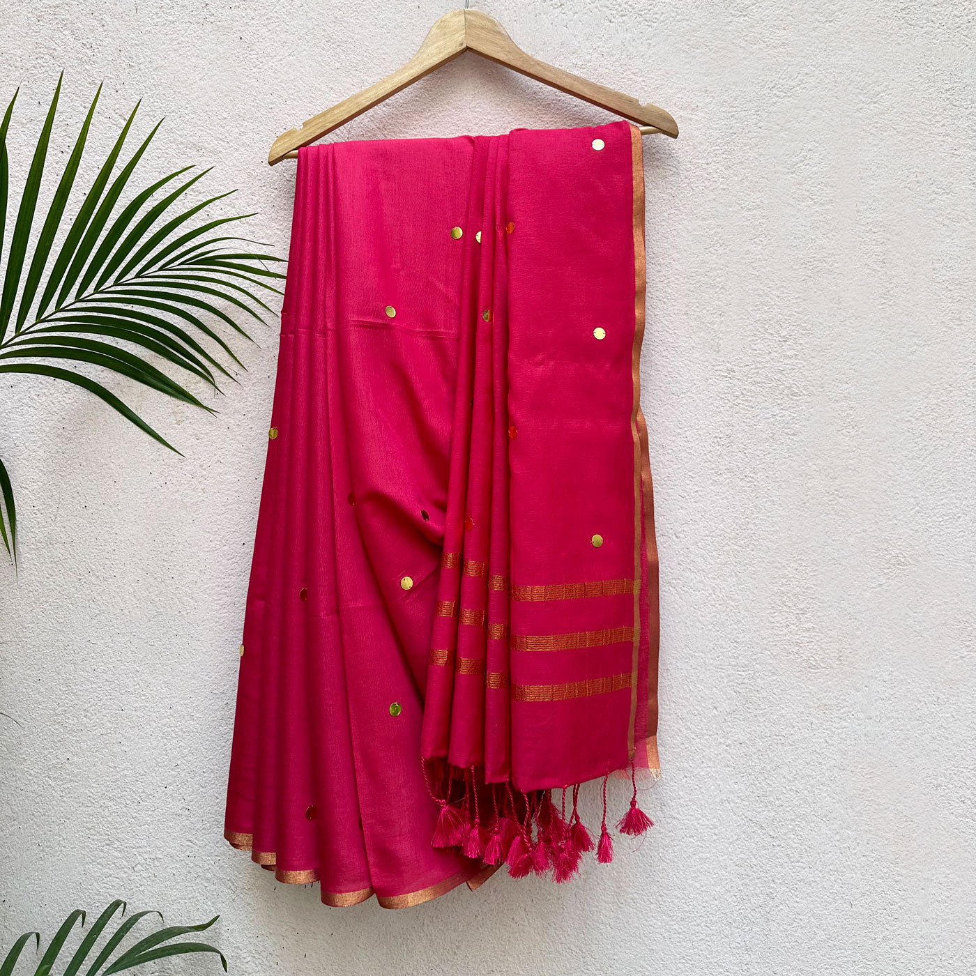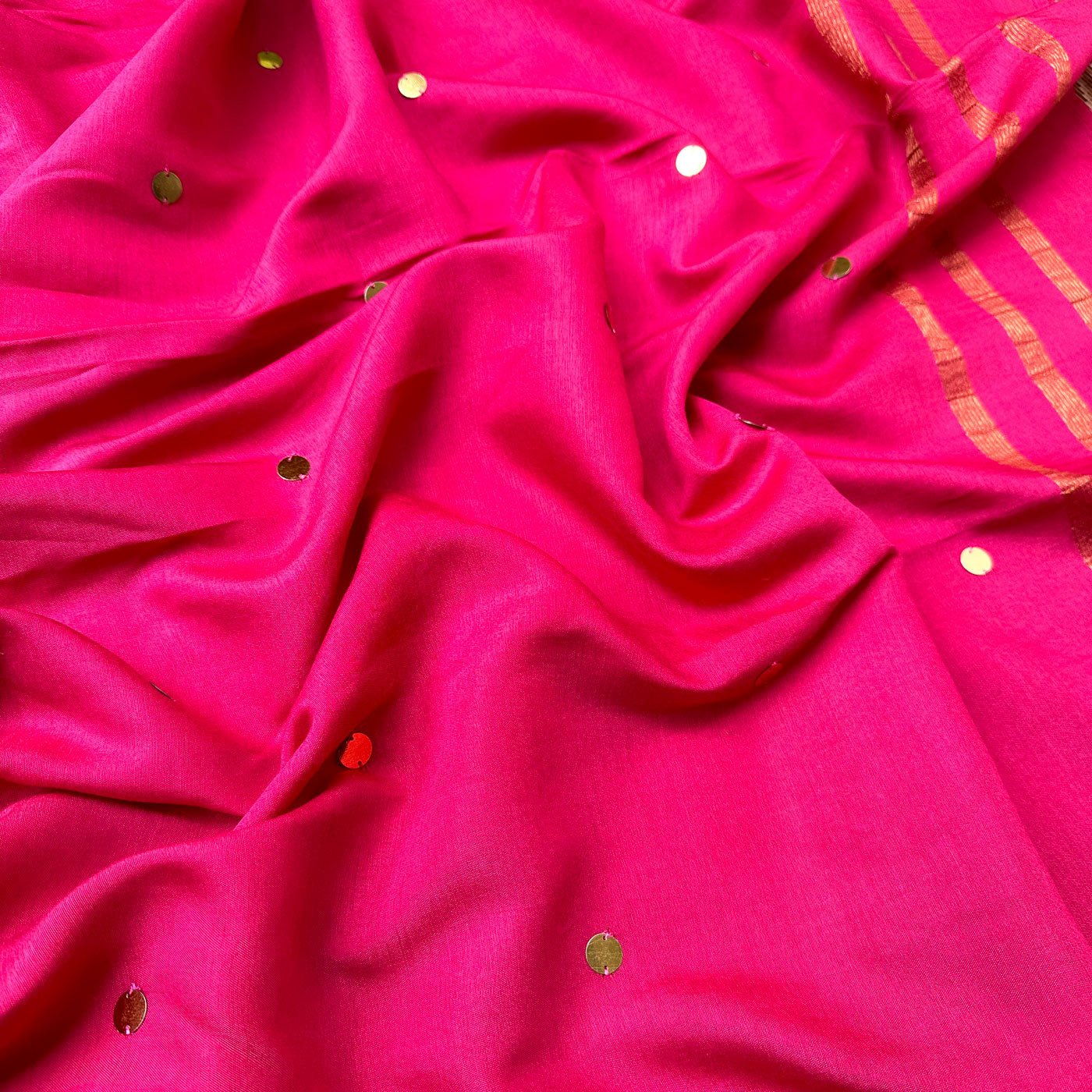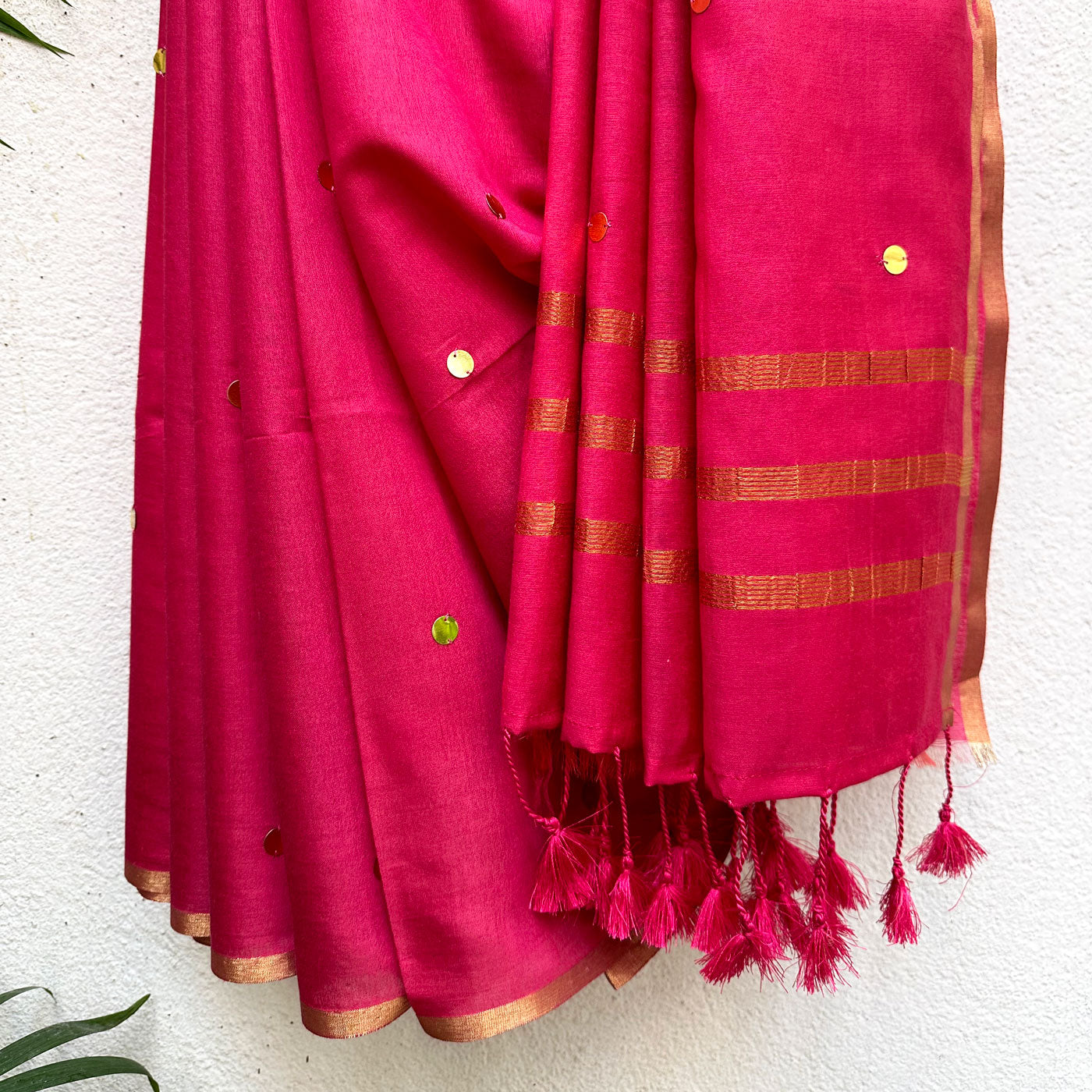Stand out in the lively Pink Knock Out Cotton Silk Sequins Saree! Crafted with luxurious cotton silk, this saree shines with dazzling sequins and a delicate gold trim. Its whimsical tassels add a playful twist, making it perfect for any event, whether it's a bash or a casual hangout. With its array of captivating colors, this saree is sure to win over hearts (and turn heads)!