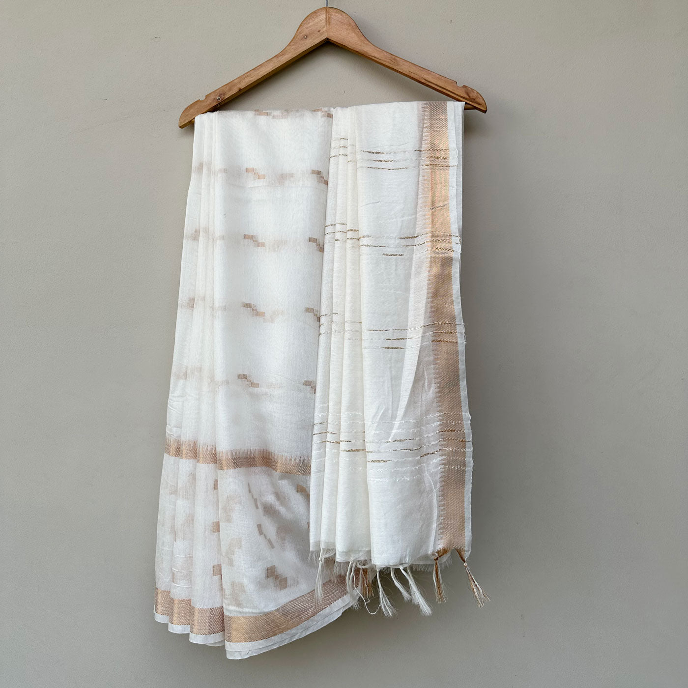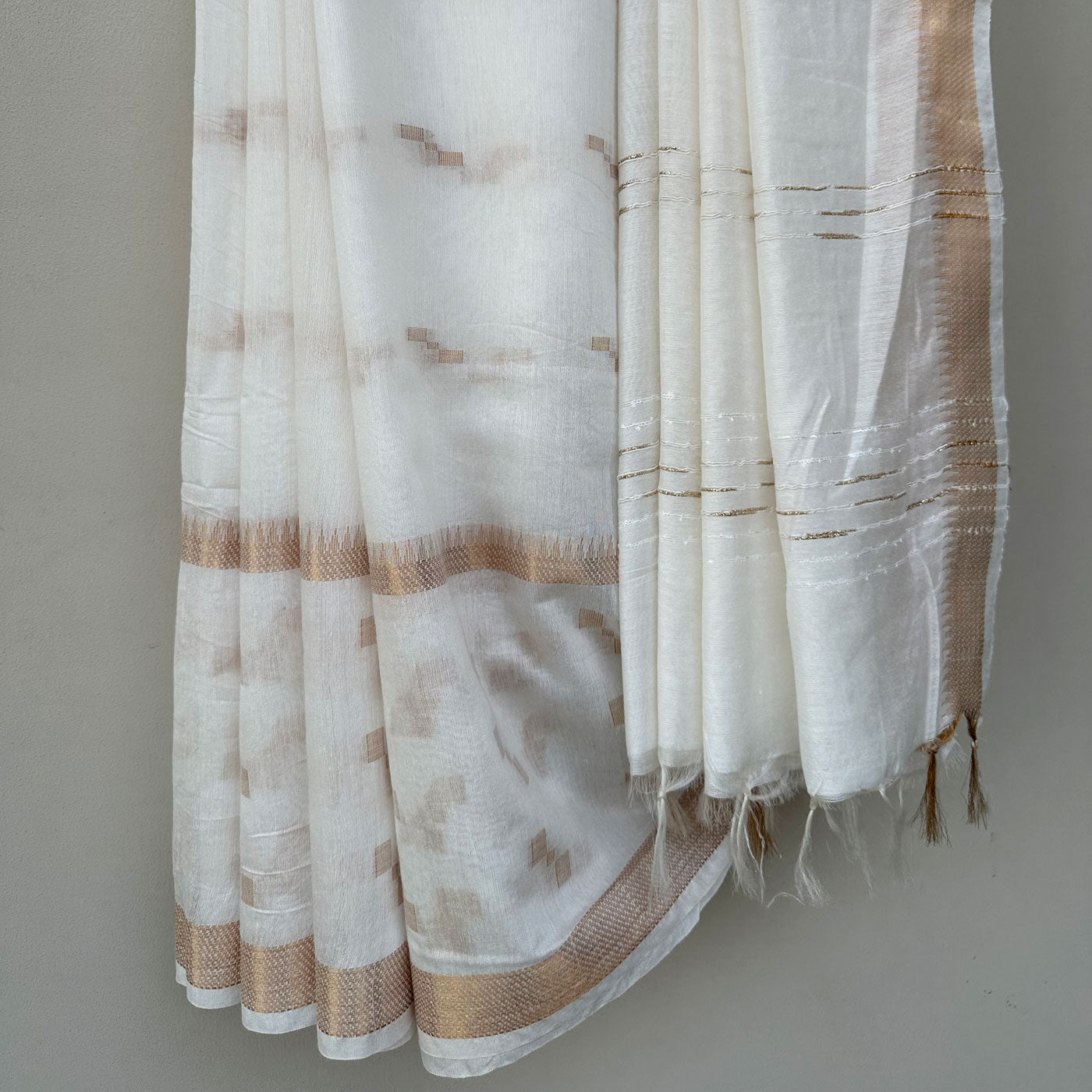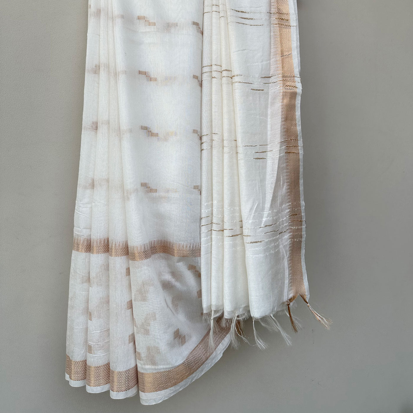 This elegant saree features a pearl white base highlighted by a checkered zari border, exuding refined charm. The body showcases delicate checkered butis, while the tasseled pallu is enhanced with horizontal ghicha and zari stripes, creating a graceful ensemble. Perfect for Onam festivities, its border is beautifully decorated with classic temple motifs. This exquisite cotton silk saree promises to make you the center of attention with its timeless appeal.