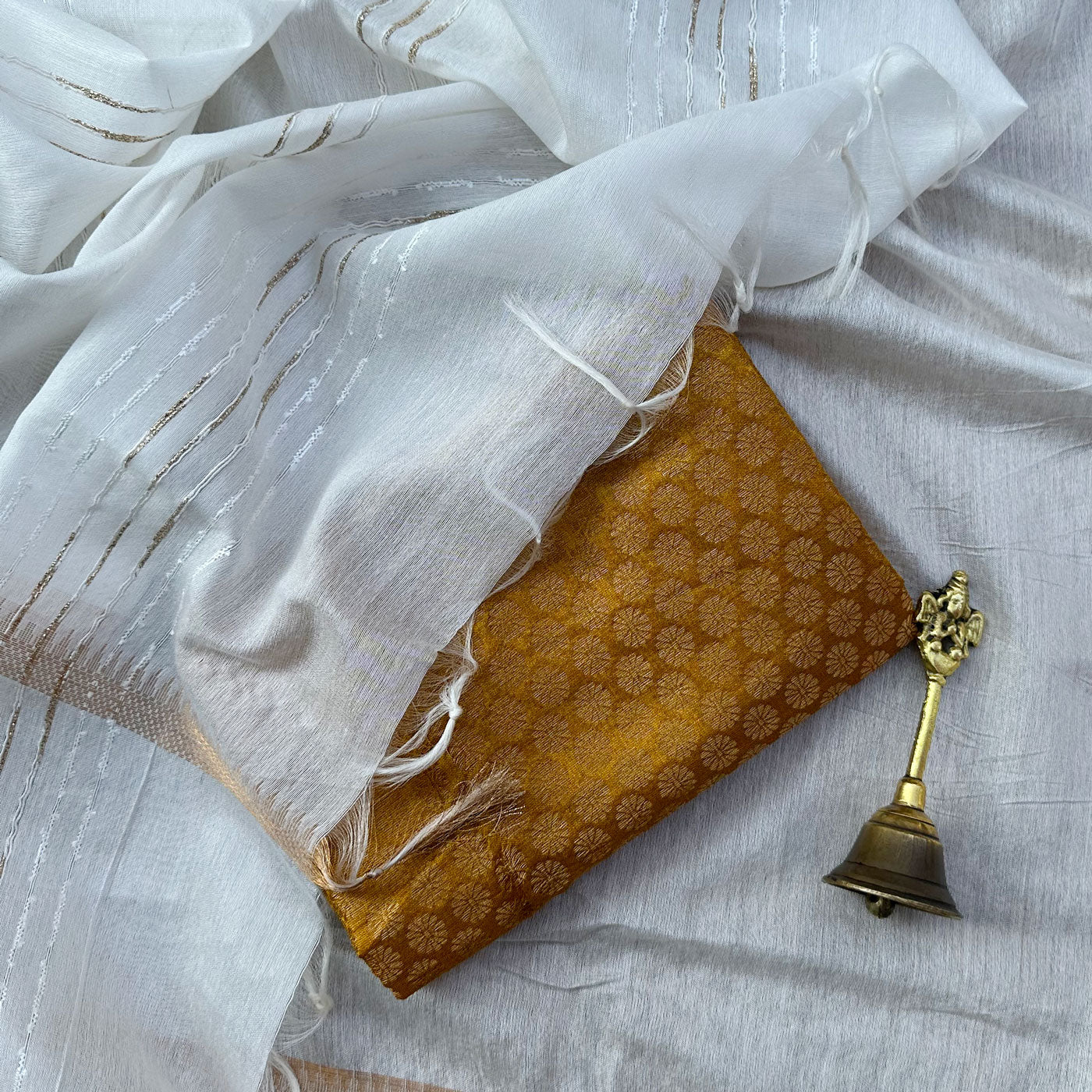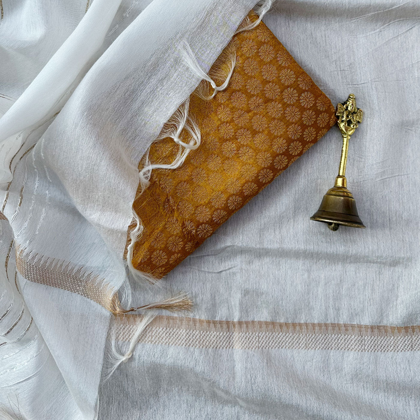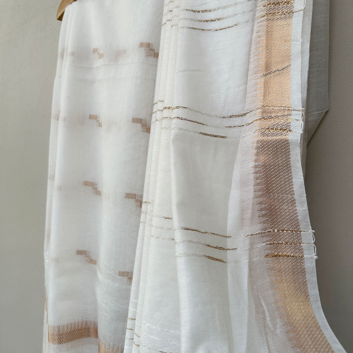 This elegant saree features a pearl white base highlighted by a checkered zari border, exuding refined charm. The body showcases delicate checkered butis, while the tasseled pallu is enhanced with horizontal ghicha and zari stripes, creating a graceful ensemble. Perfect for Onam festivities, its border is beautifully decorated with classic temple motifs. This exquisite cotton silk saree promises to make you the center of attention with its timeless appeal.