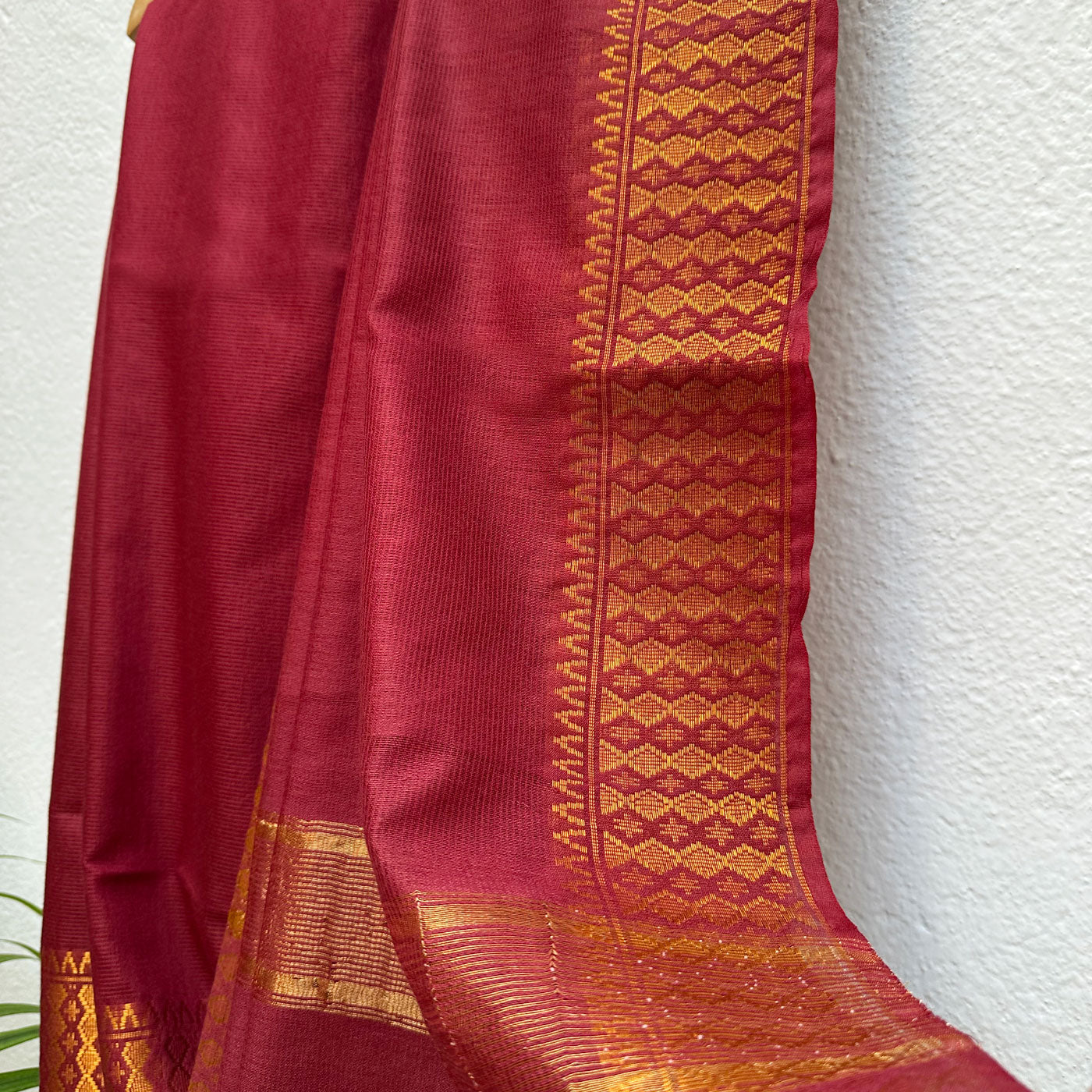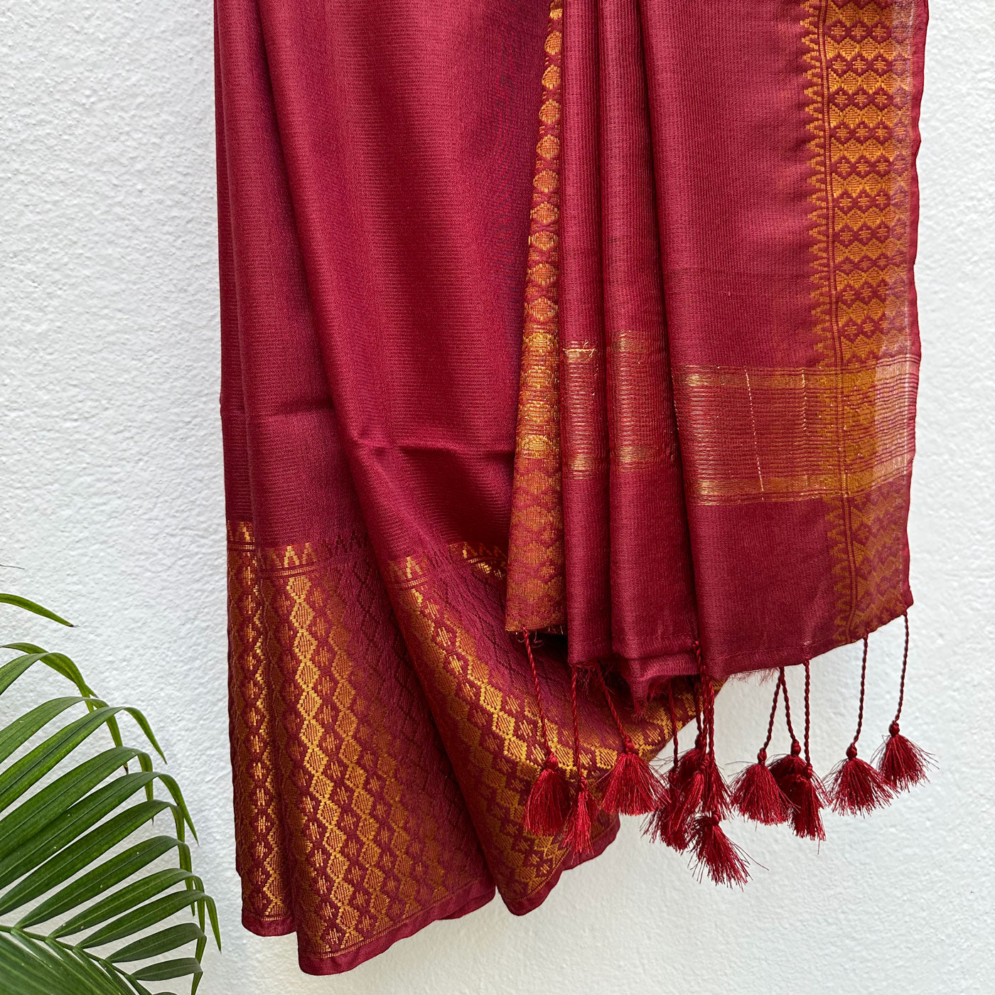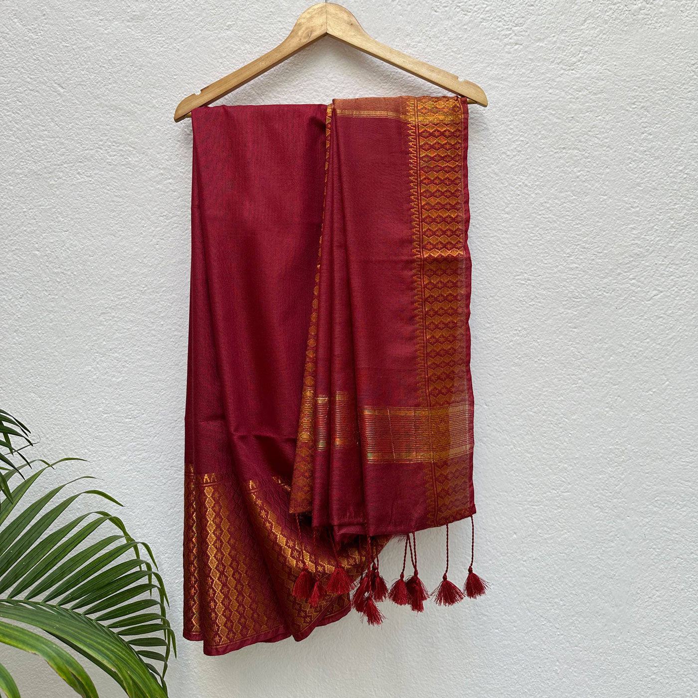 Upgrade your outfit for your next wedding or celebration with this elegant and distinctive saree, featuring a bold diamond-shaped border and a temple-inspired design. Crafted from cotton viscose silk and matching tassels, it is the perfect statement piece for your wardrobe. Keep it effortless and stylish with the matching printed blouse included.