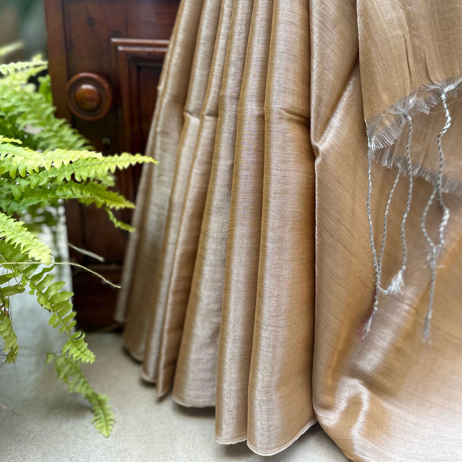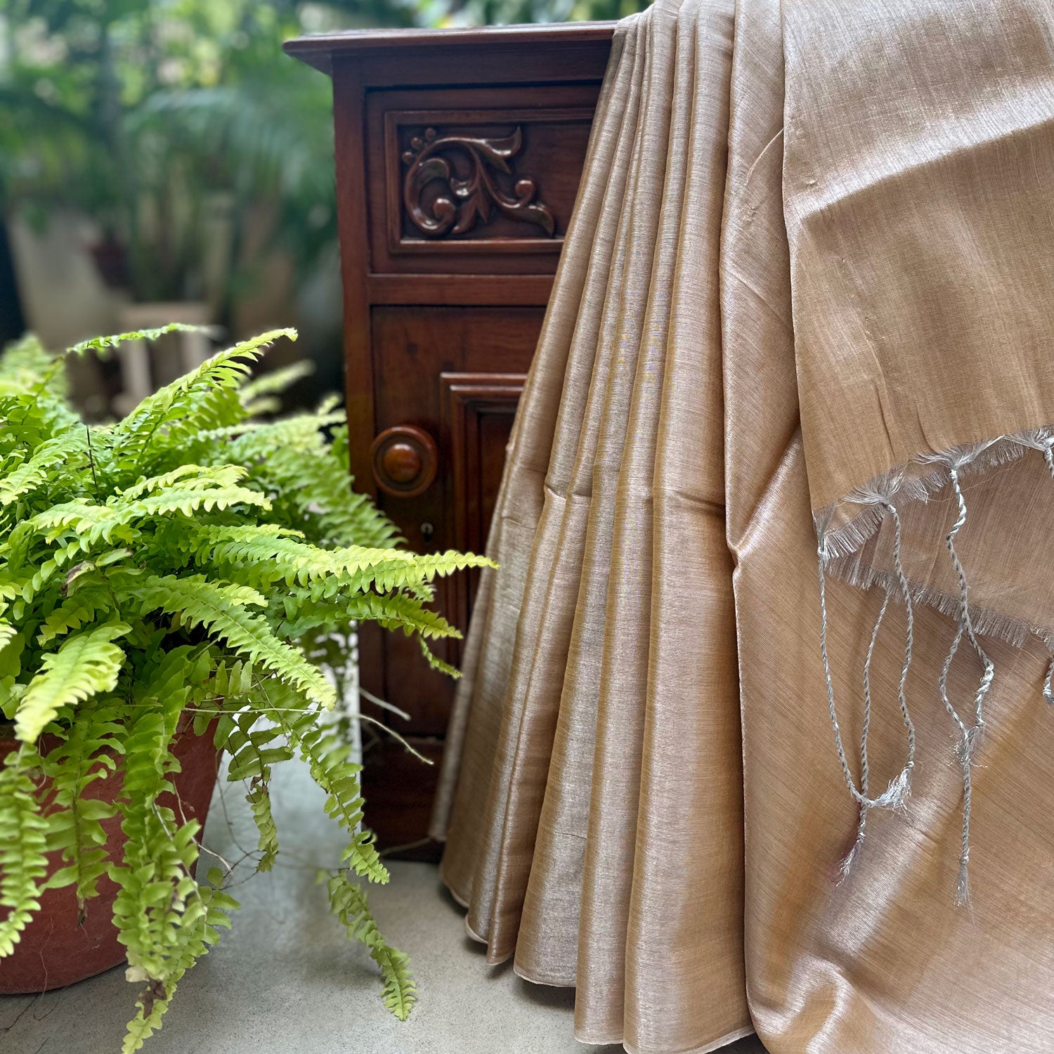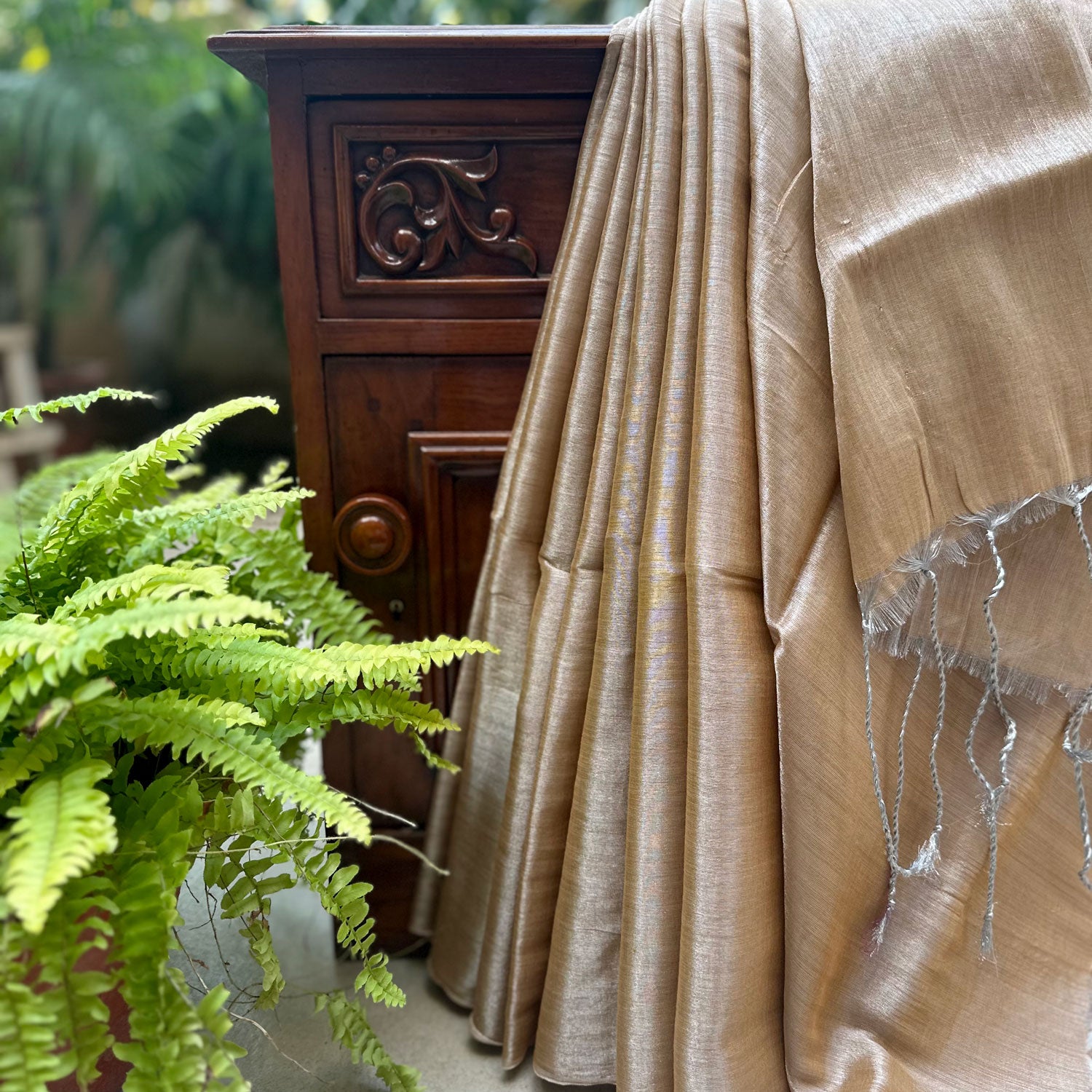 Unleash your bold and adventurous side with our Raag Todi Mul Tissue Saree, a celebration of understated elegance wrapped in shimmering silver. Crafted from luxurious mul tissue fabric, this saree drapes with effortless grace, catching light with every movement. Whether you're channeling your inner sophisticate or embracing a moment of playful confidence, this saree seamlessly blends tradition with contemporary flair. Let the subtle shimmer and refined craftsmanship speak volumes about your impeccable taste. A wardrobe essential that transforms how you carry yourself.