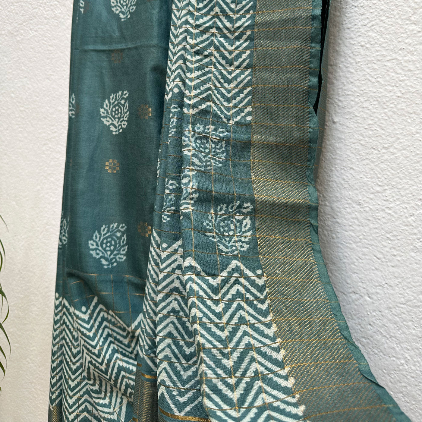 Enhance your wardrobe with this beautiful cotton-silk saree, featuring a bold gold stripe border accented by a lively handblock chevron pattern. The tassels on the pallu add a unique touch, while the handblock motifs, gold butas, and checks design throughout the saree offer a harmonious blend of classic elegance and vibrant spirit. Designed to uplift your confidence and draw admiration, this saree is a wonderful choice for making a memorable and graceful statement at any occasion.