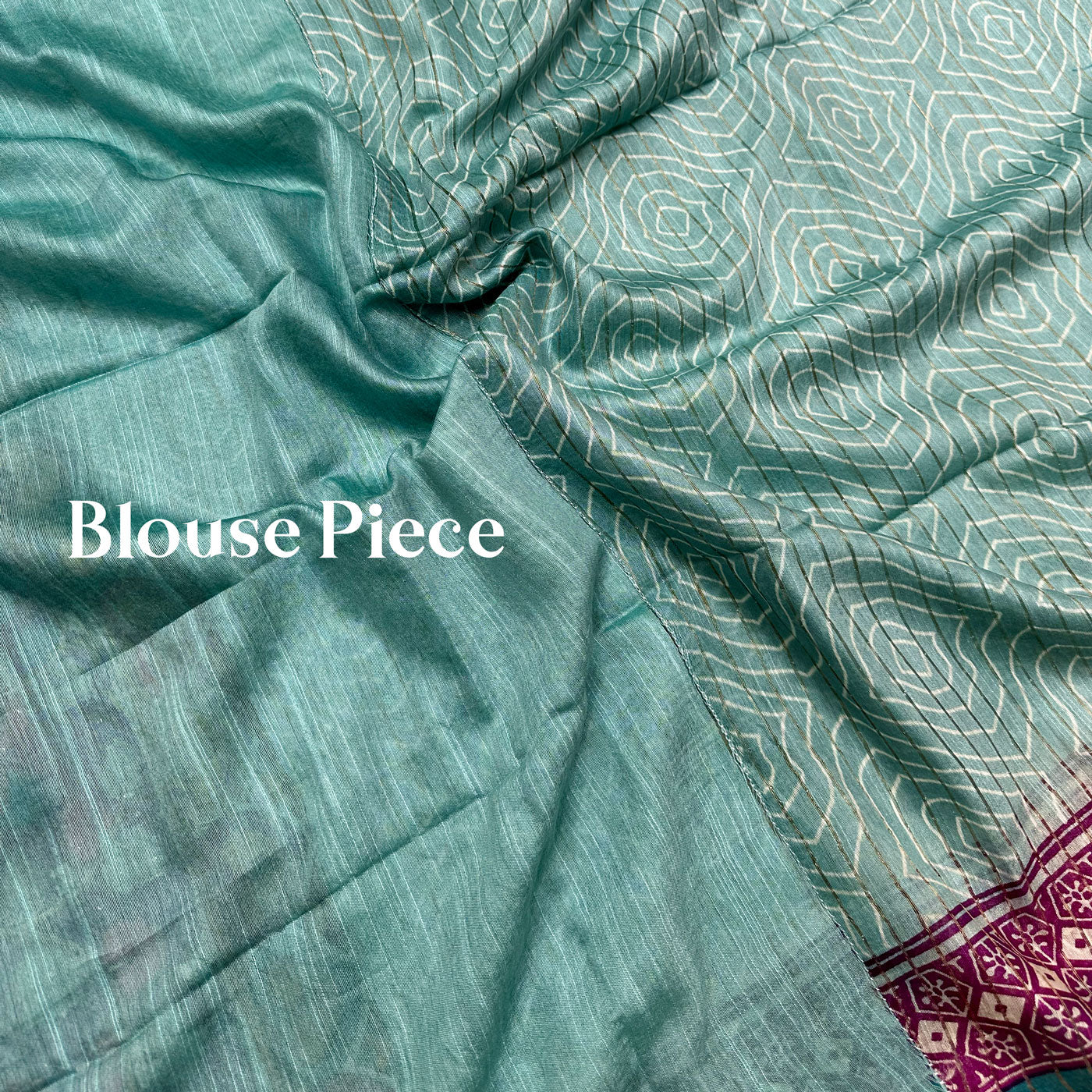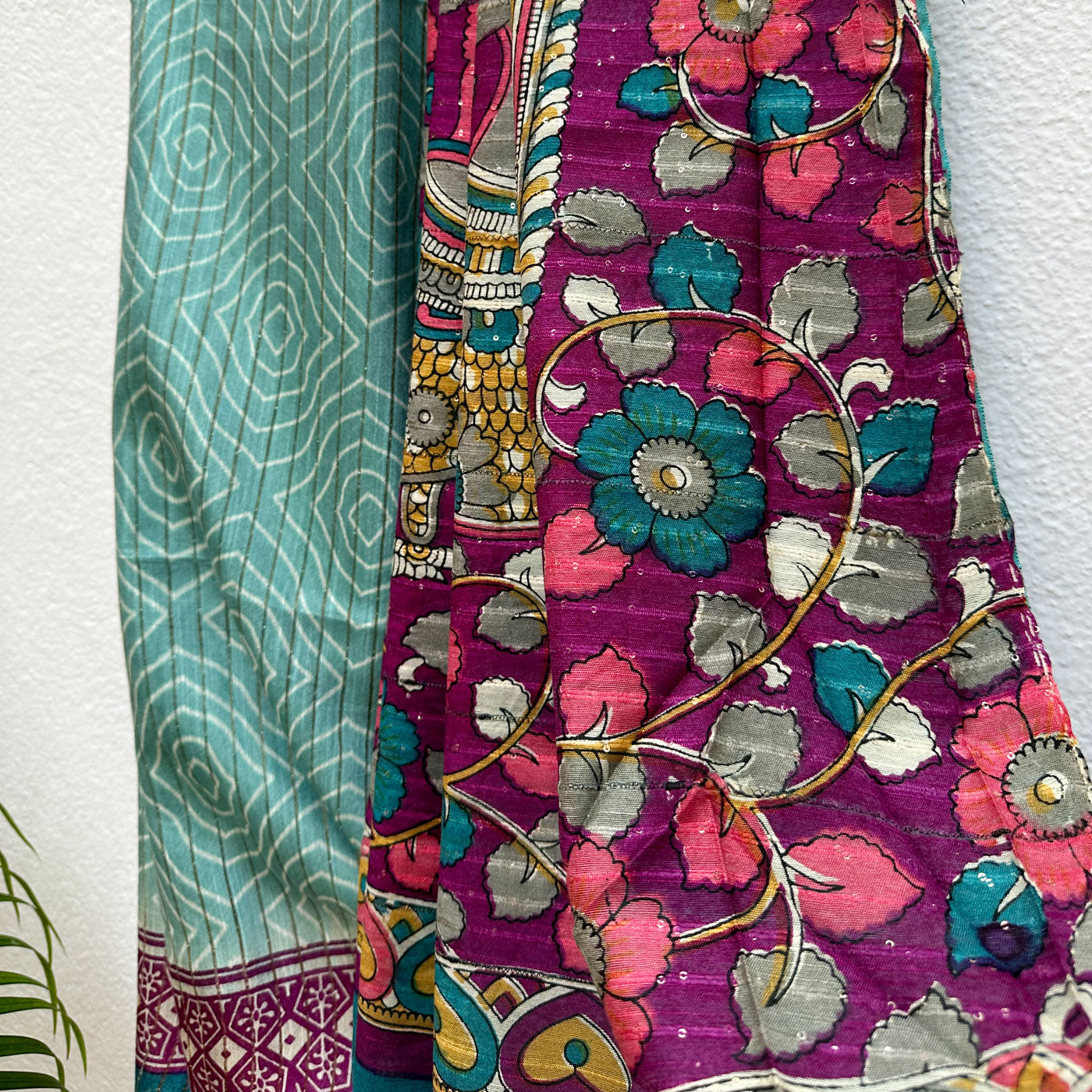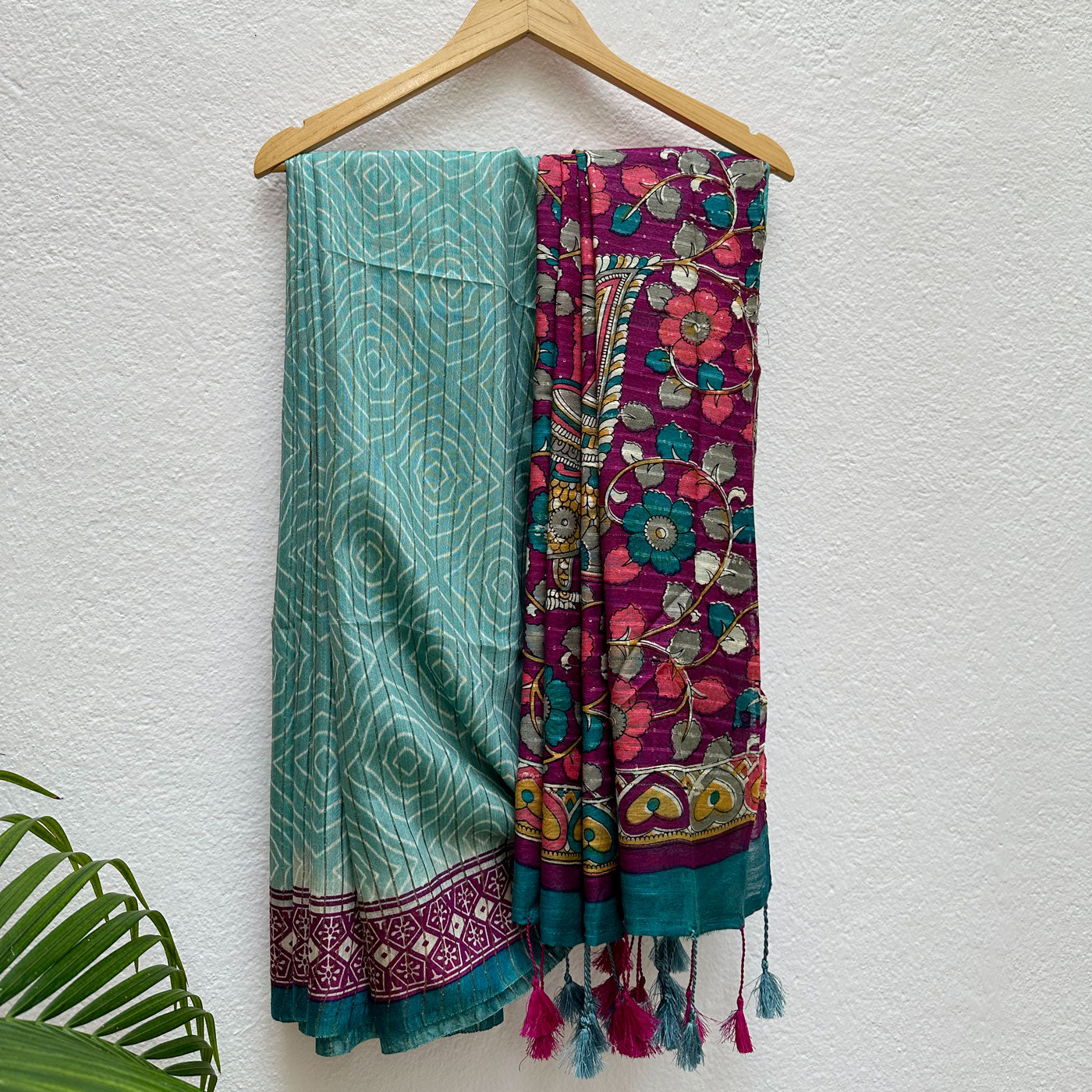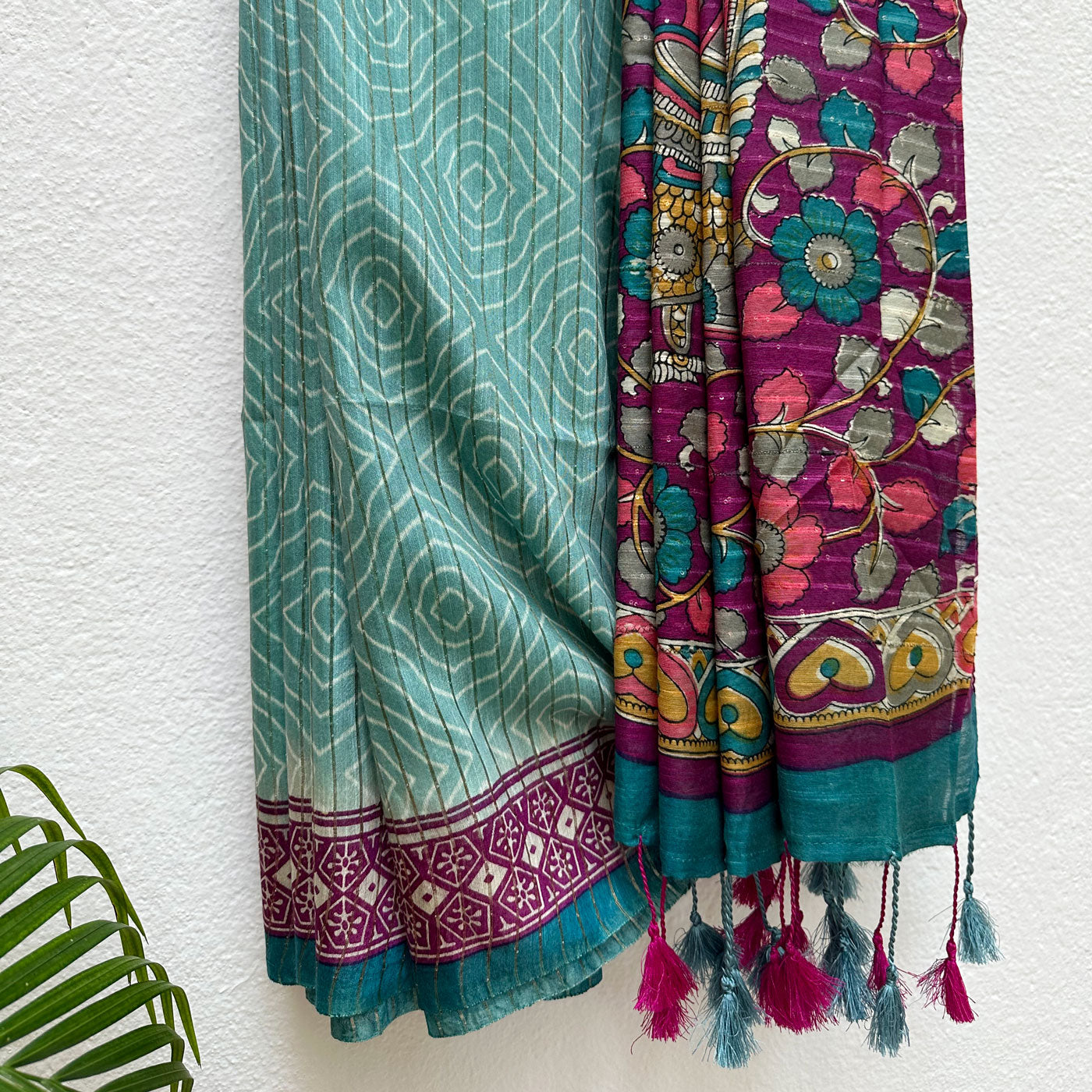 Spice up your wardrobe with the chic ogee prints on the main body, highlighted by shimmering gold zari stripes and complimenting vibrant kalamkari design on the pallu. This saree's pallu is all about fashion, complete with funky double-colored tassels and sparkly sequins for a pop of fun. Make a statement and show off your fashion-forward side with this one-of-a-kind saree.