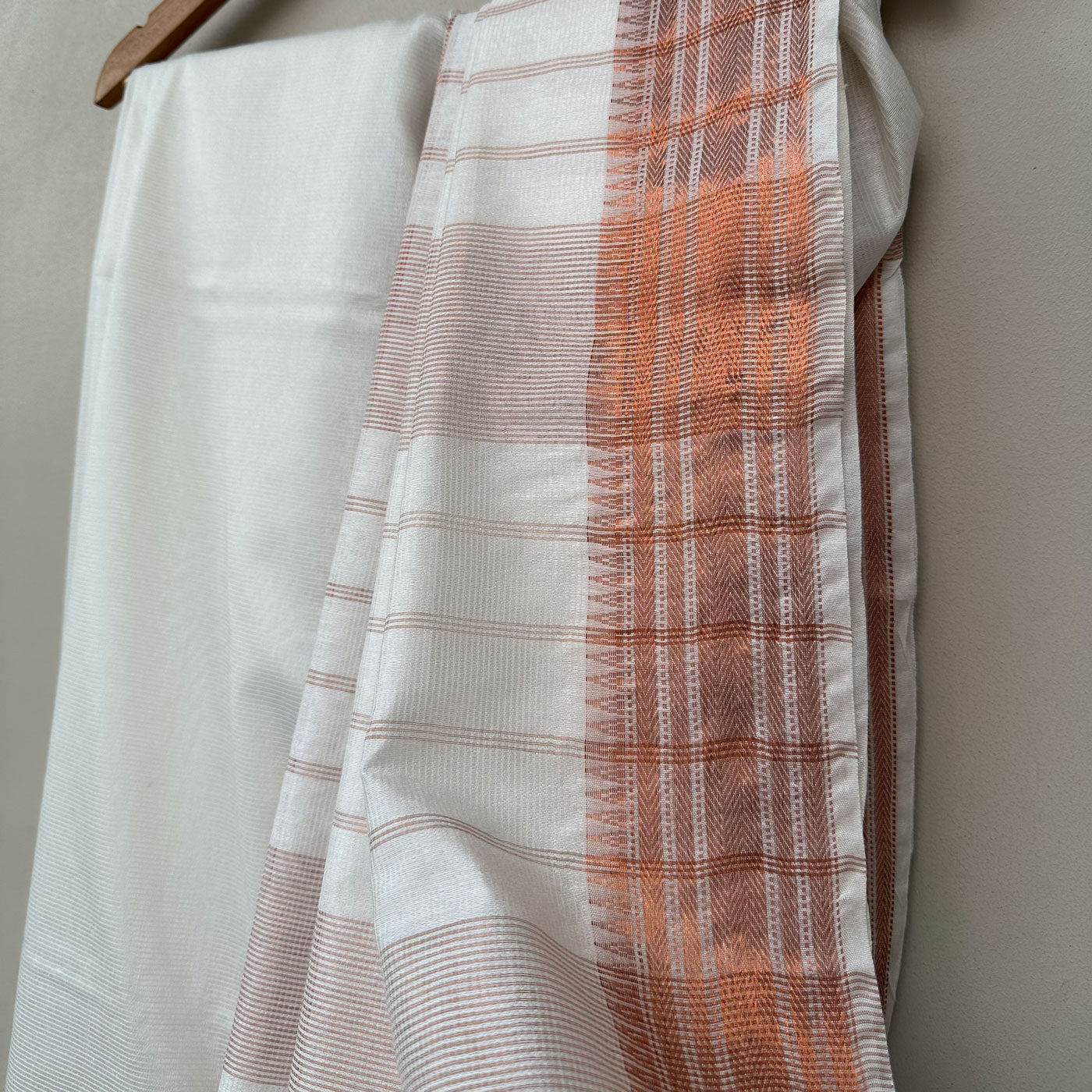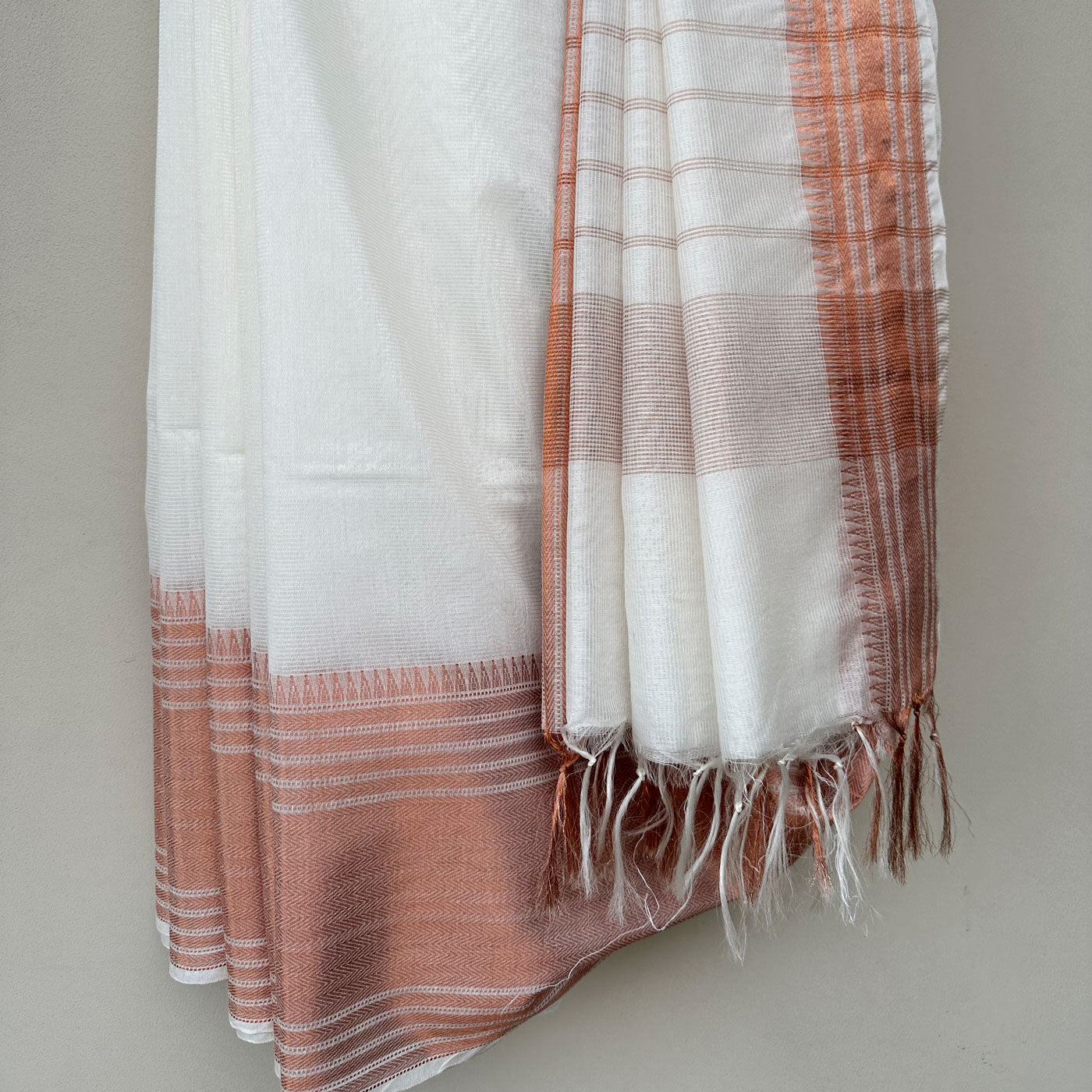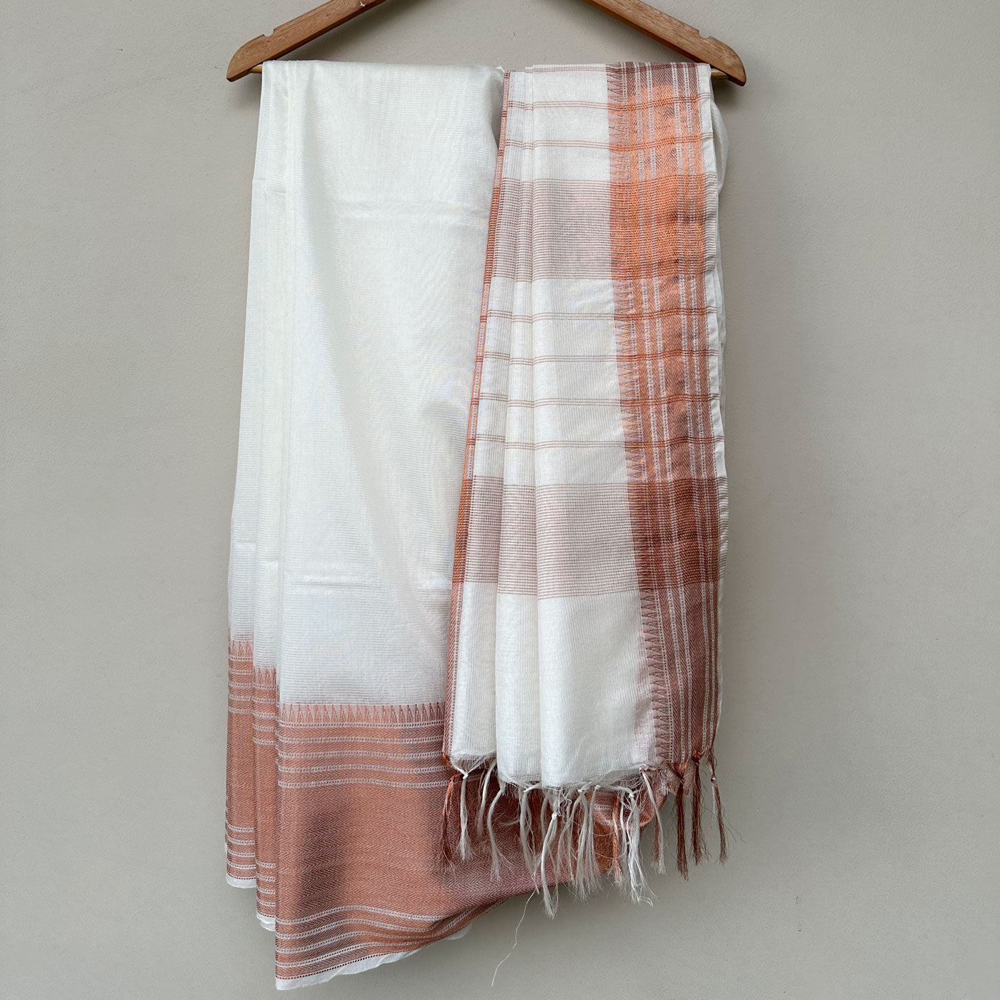Experience the opulence and elegance of our stunning Rohini Cotton Silk Saree. This one-of-a-kind piece showcases a pearl white base adorned with a mesmerizing copper zari temple border and delicate patterns, oozing sophistication. The pallu features exquisite horizontal stripes, adding the perfect finish to this exquisite saree. Don't miss out on the extra banarasi brocade blouse piece, featuring intricate floral designs in multiple colors. Upgrade your wardrobe today with this luxurious saree.