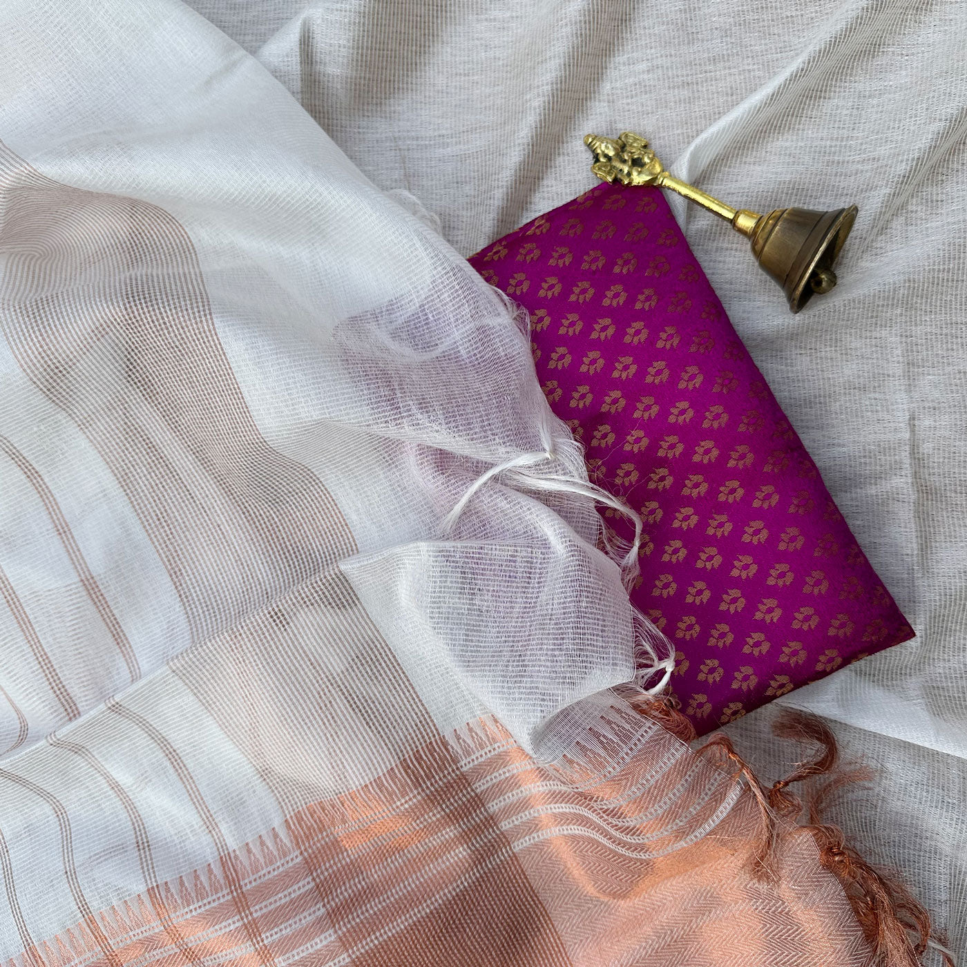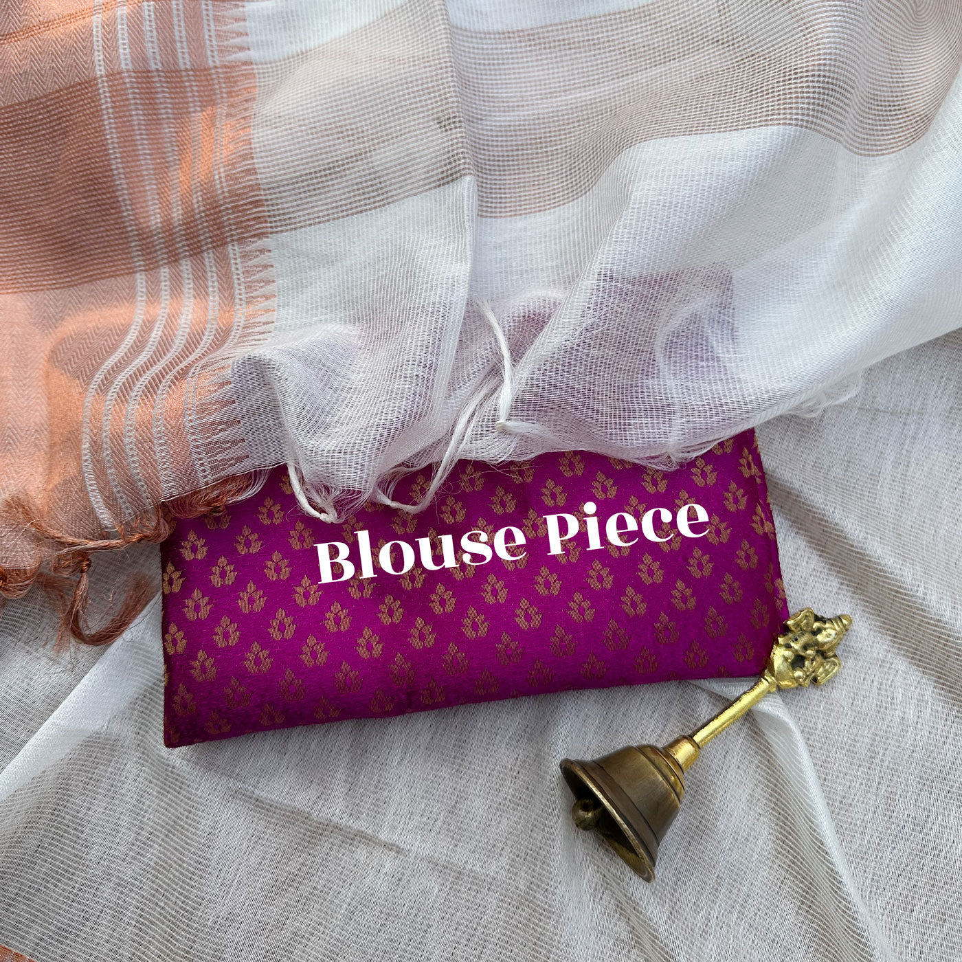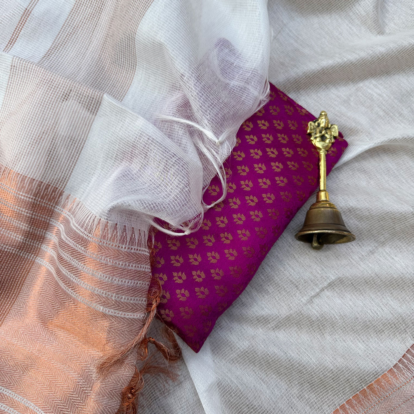 Experience the opulence and elegance of our stunning Rohini Cotton Silk Saree. This one-of-a-kind piece showcases a pearl white base adorned with a mesmerizing copper zari temple border and delicate patterns, oozing sophistication. The pallu features exquisite horizontal stripes, adding the perfect finish to this exquisite saree. Don't miss out on the extra banarasi brocade blouse piece, featuring intricate floral designs in multiple colors. Upgrade your wardrobe today with this luxurious saree.