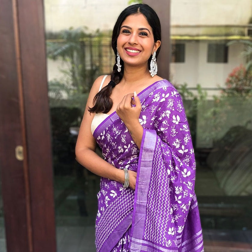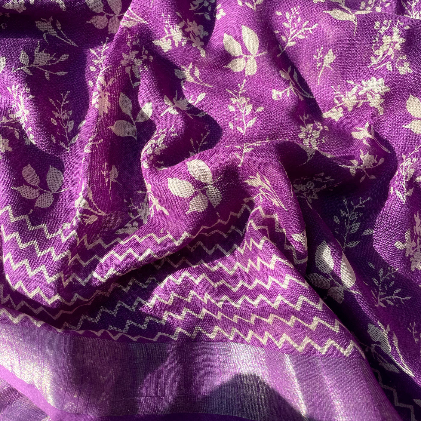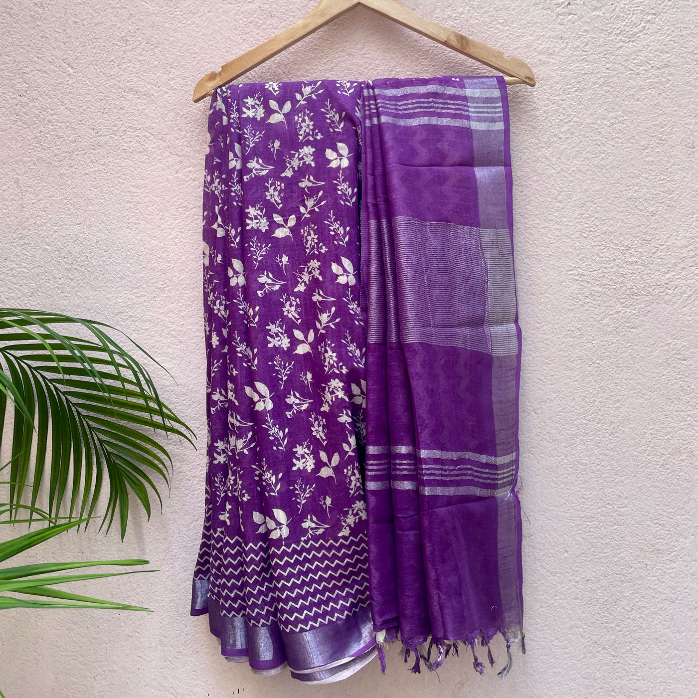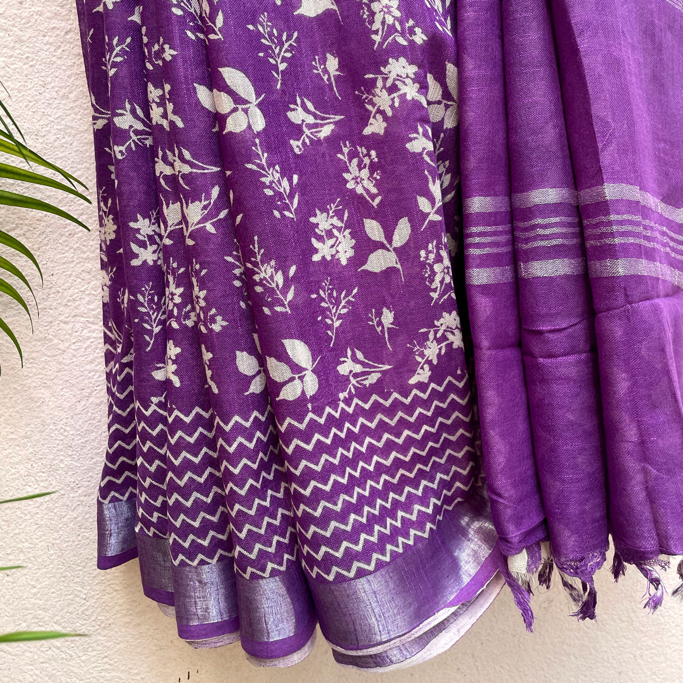 They bring out the true colours of the spirit. This Royal Purple blue organic linen printed saree with a combination of foliage silhouette and chevron on a silver zari border will surely make you feel in midst of nature.