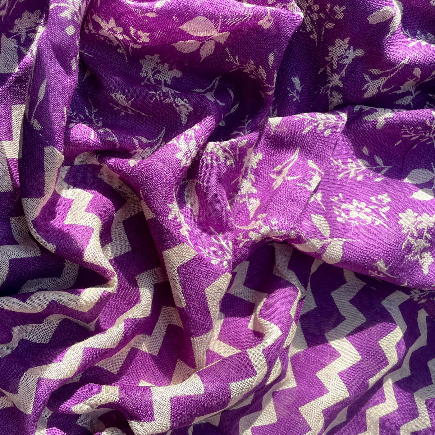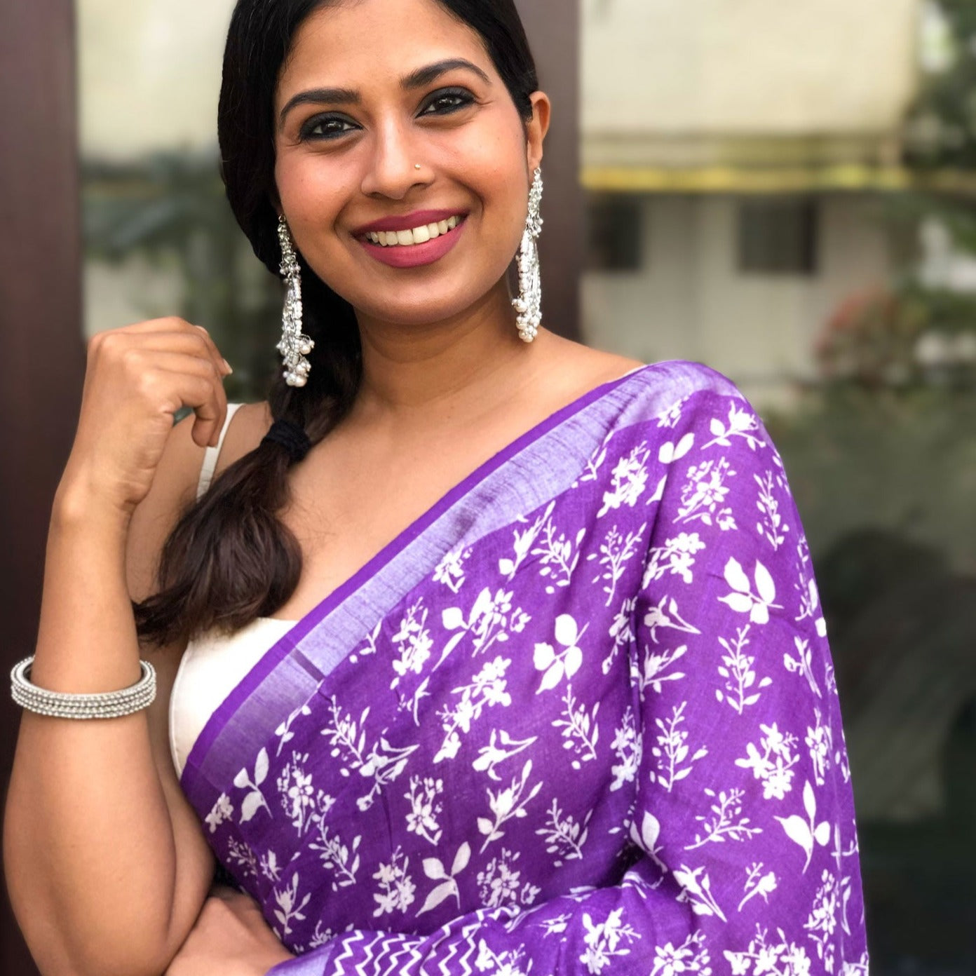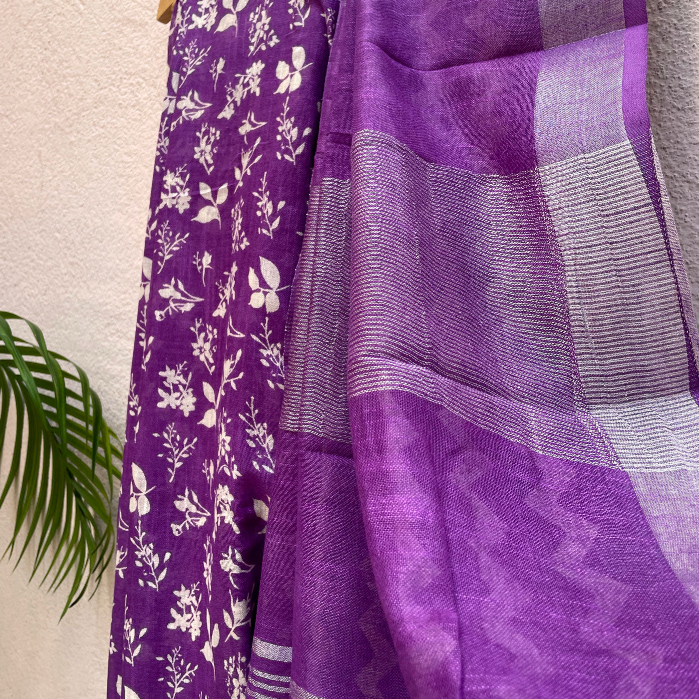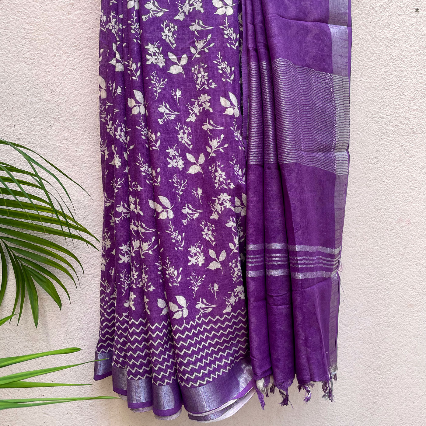 They bring out the true colours of the spirit. This Royal Purple blue organic linen printed saree with a combination of foliage silhouette and chevron on a silver zari border will surely make you feel in midst of nature.