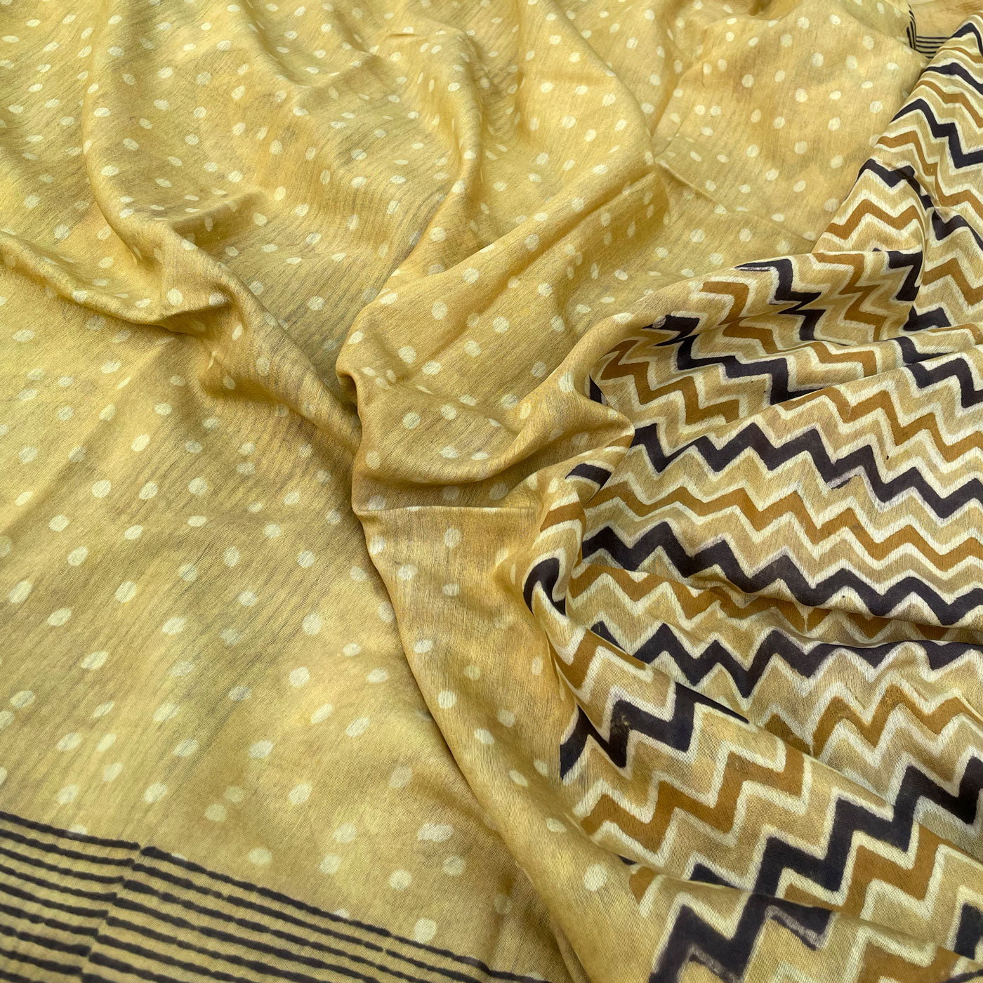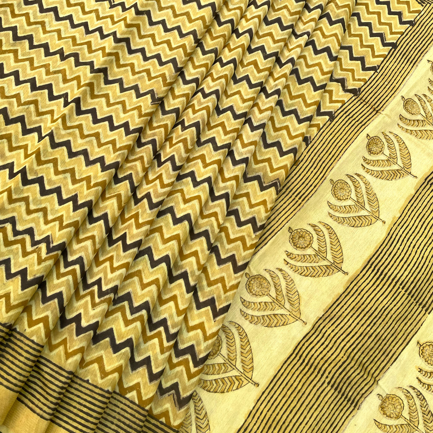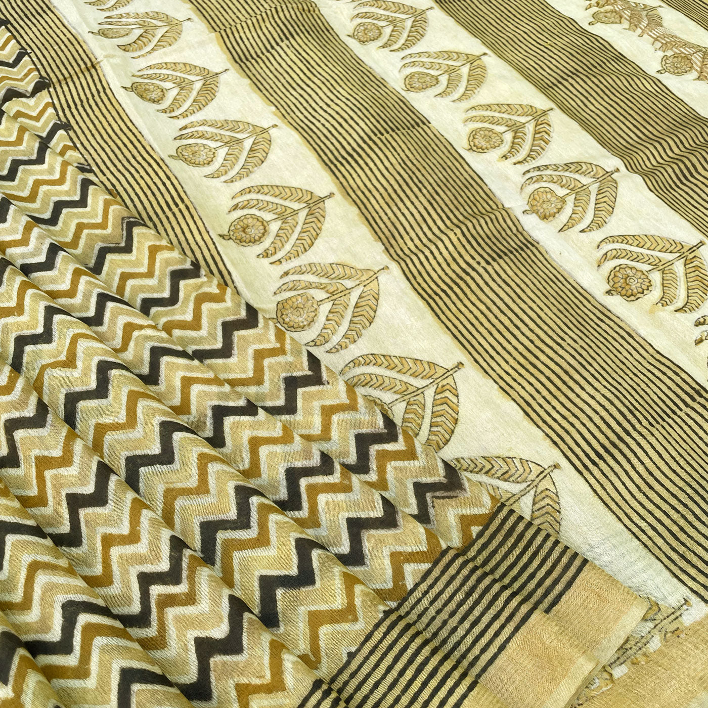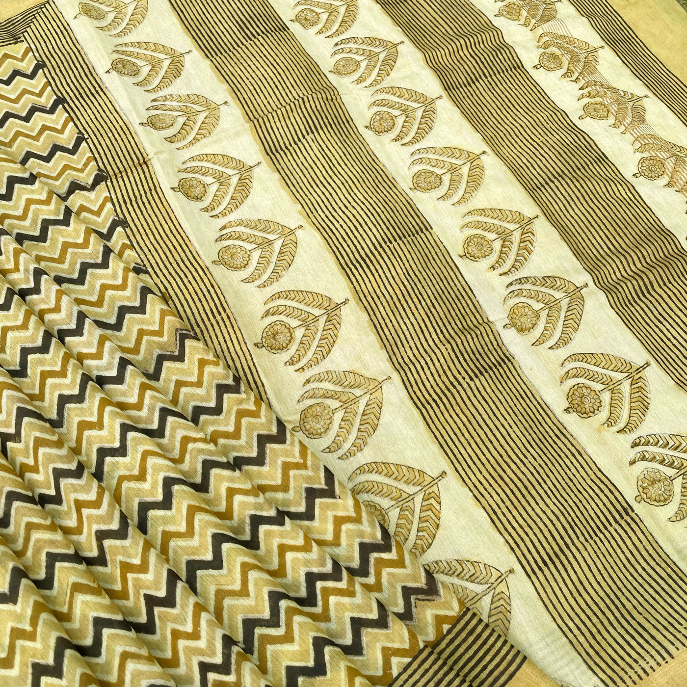 Zigzag hand block Jaipur print paired with stripes running along the zari border, this sure is an eye candy. The pallu features bold floral motifs on an ivory white base.