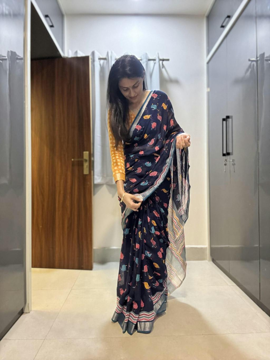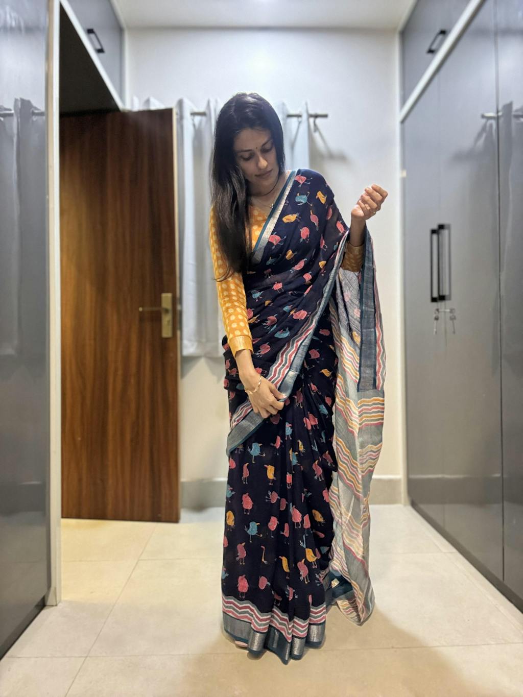 Beautiful bird print on a navy blue base along with contrasting stripes and zari work on the border and pallu makes this one so chic.
