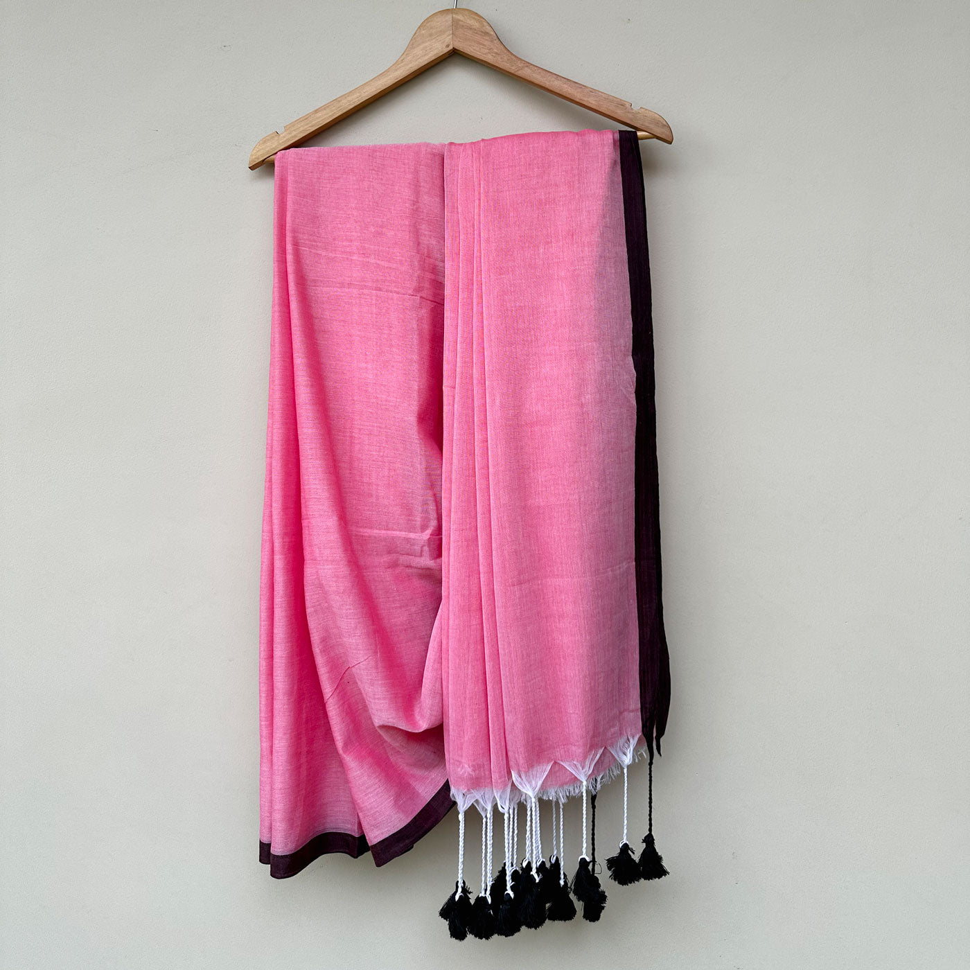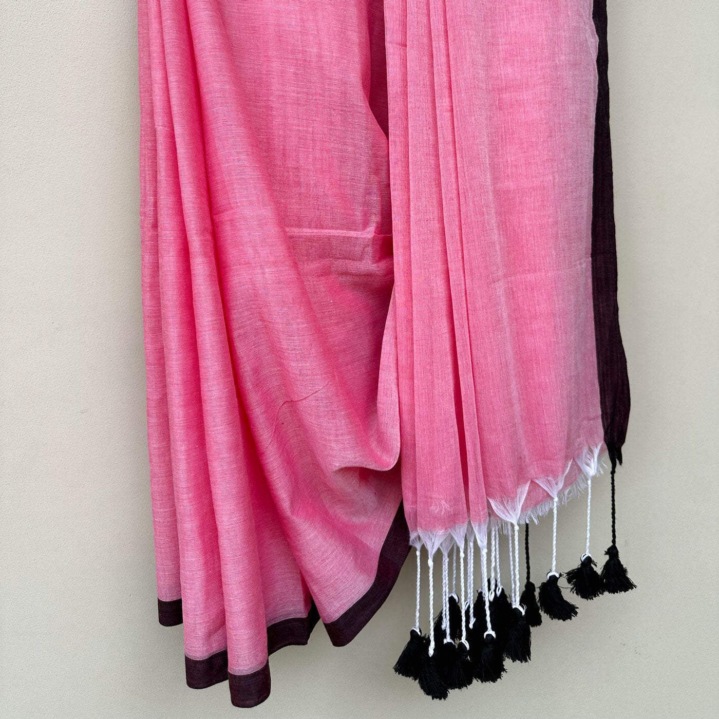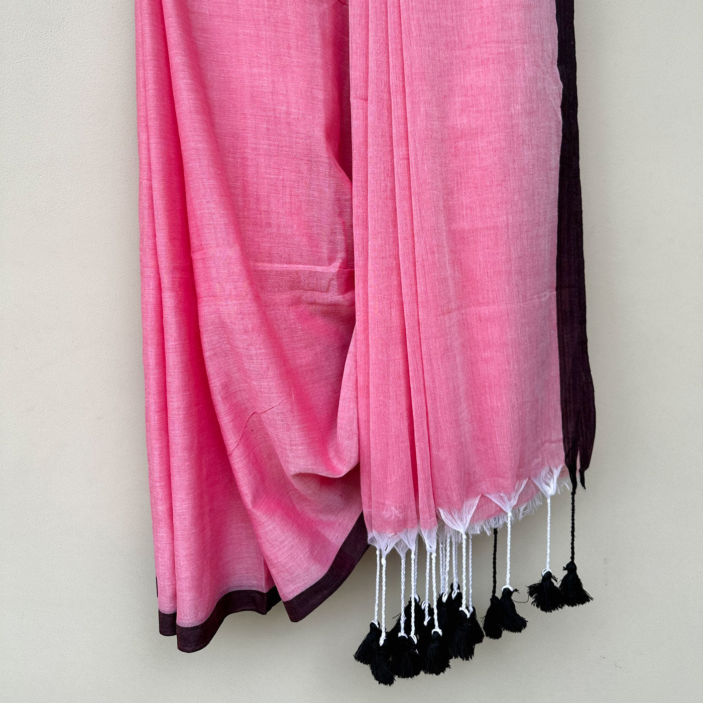 The saree features a classic plain weave highlighted by a contrasting border and delicate tassels, seamlessly blending traditional elegance with contemporary subtlety. Made from soft, breathable Mul Mul cotton, it ensures all-day comfort without compromising on style. Suitable for any event, its refined allure is complemented by charming tassels and a matching blouse piece. Add this elegant creation to your wardrobe for a perfect fusion of simplicity and sophistication.