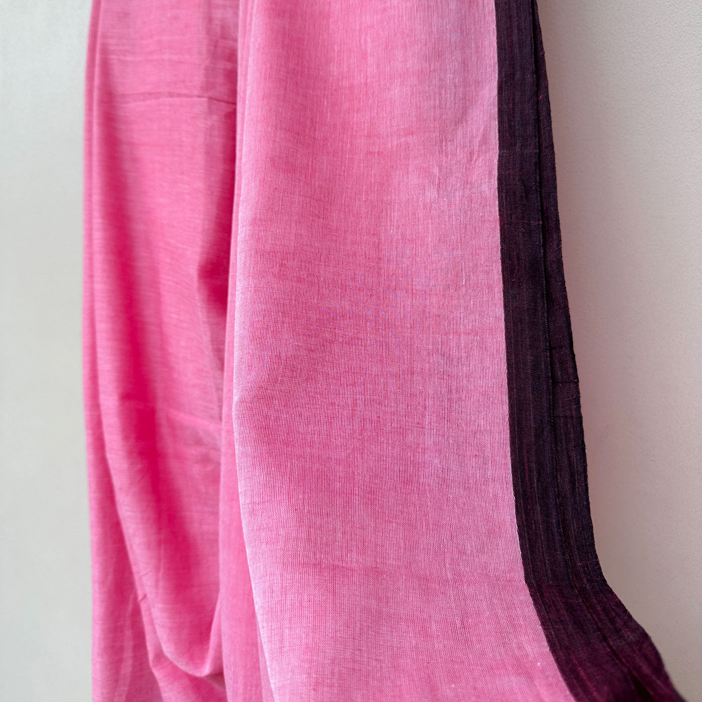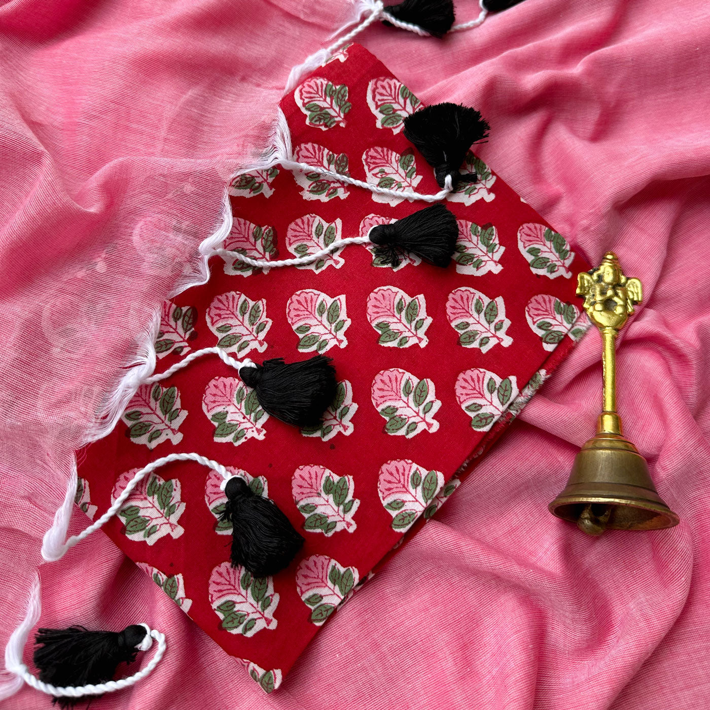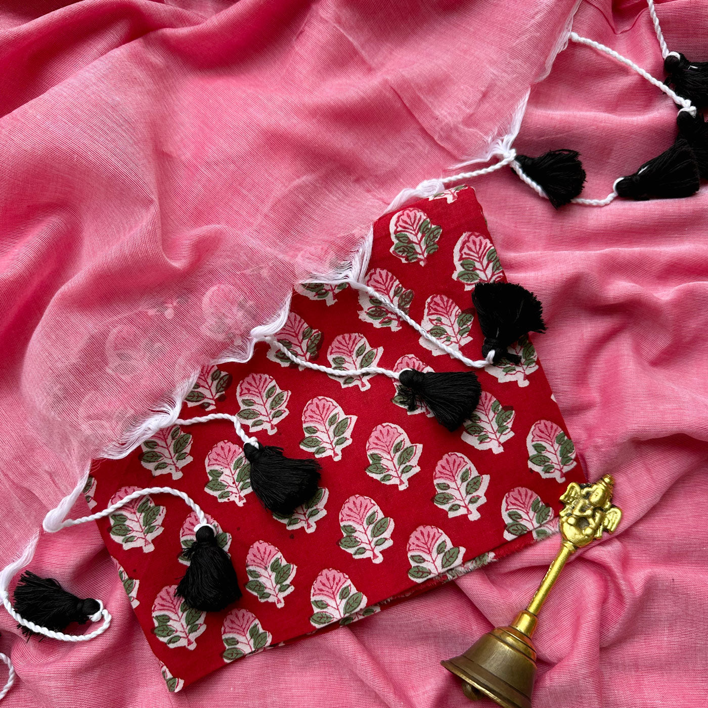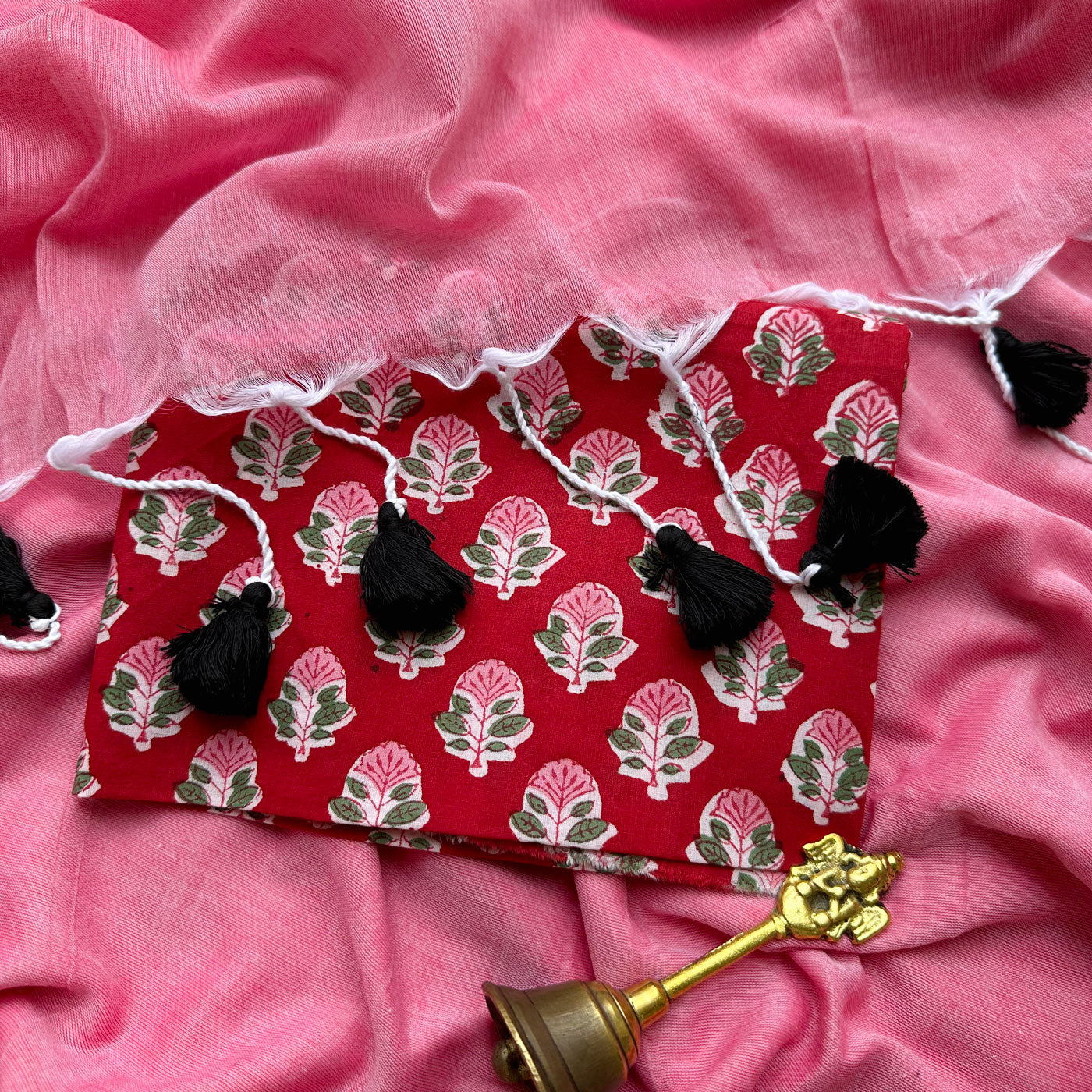 The saree features a classic plain weave highlighted by a contrasting border and delicate tassels, seamlessly blending traditional elegance with contemporary subtlety. Made from soft, breathable Mul Mul cotton, it ensures all-day comfort without compromising on style. Suitable for any event, its refined allure is complemented by charming tassels and a matching blouse piece. Add this elegant creation to your wardrobe for a perfect fusion of simplicity and sophistication.