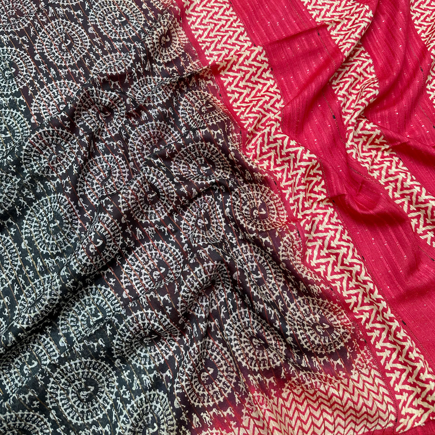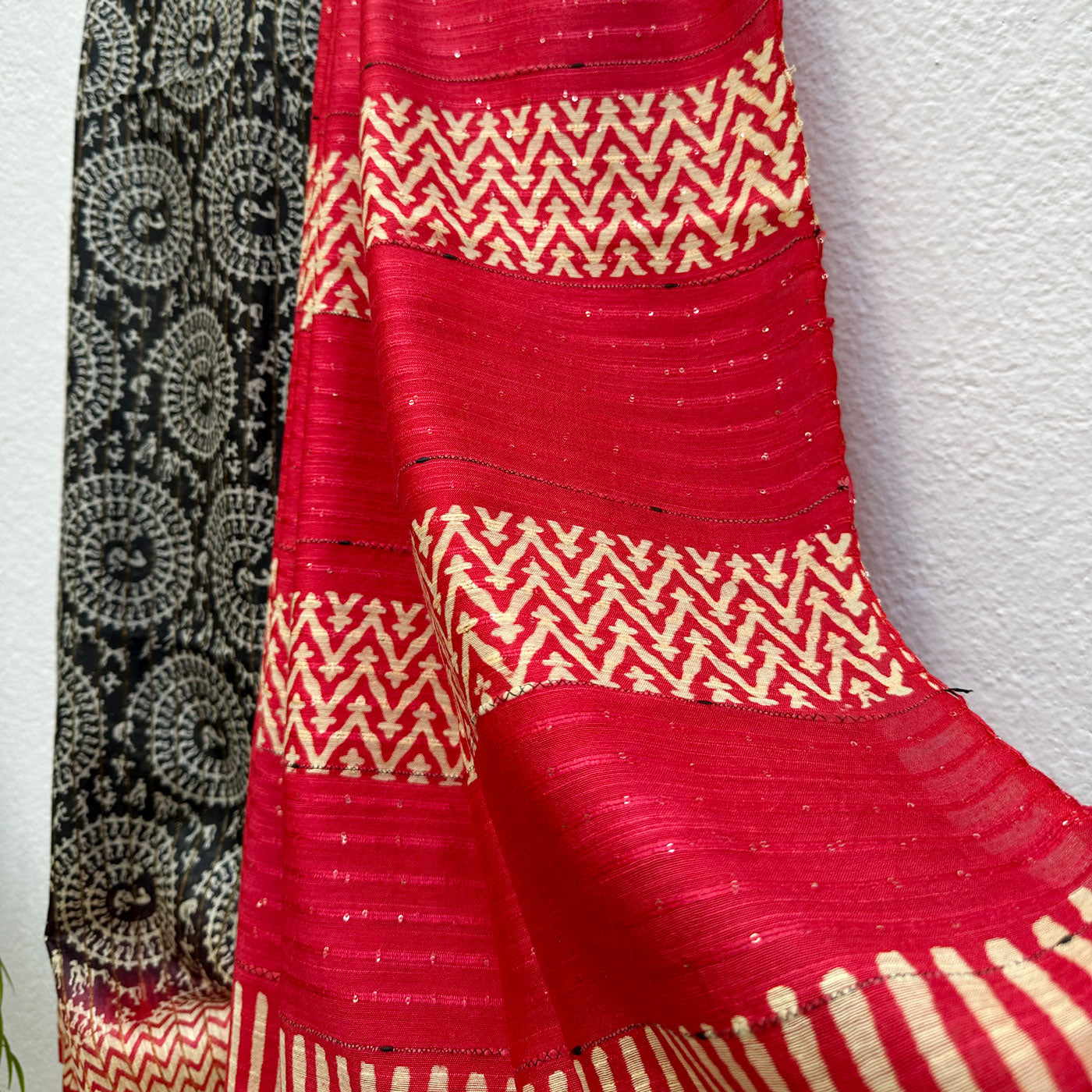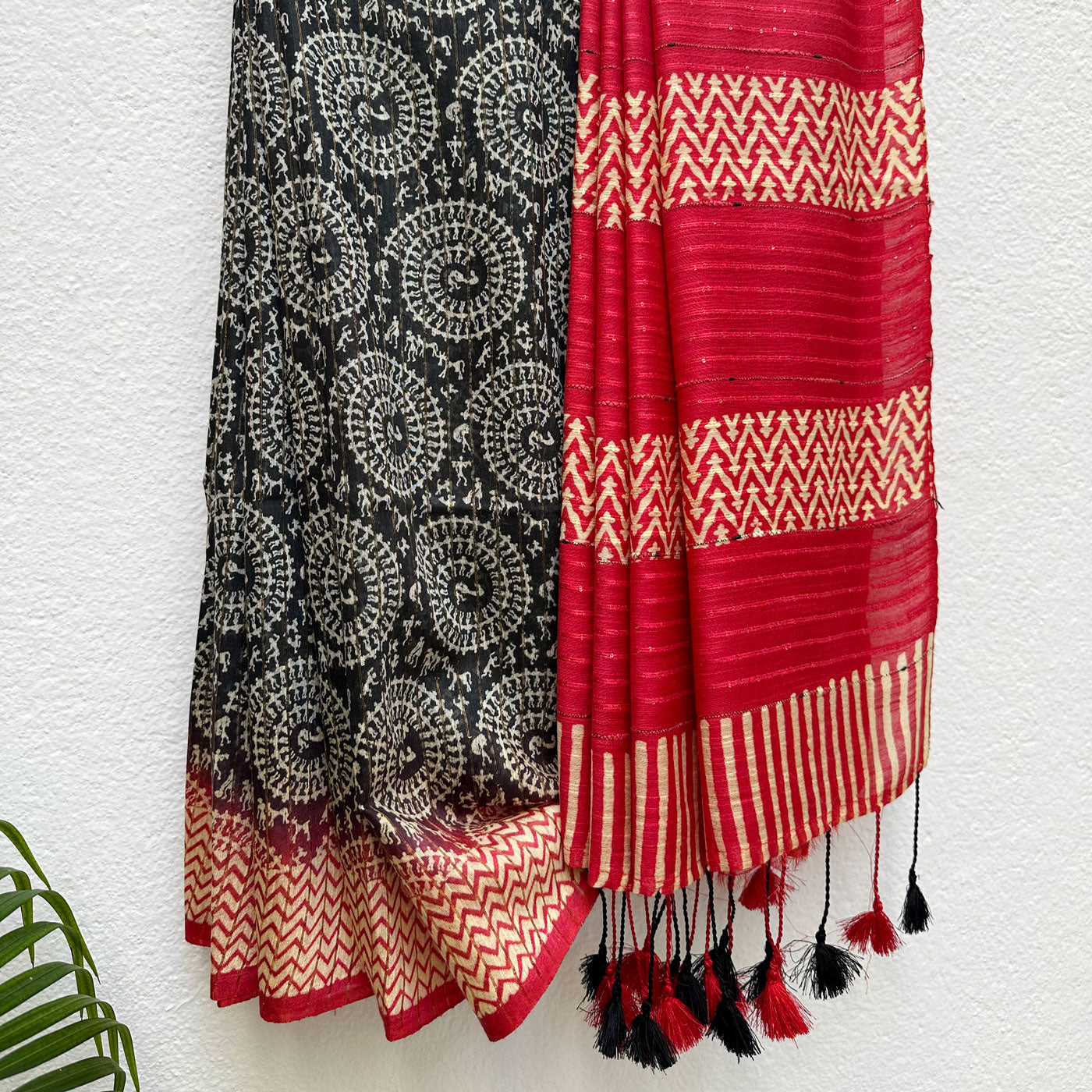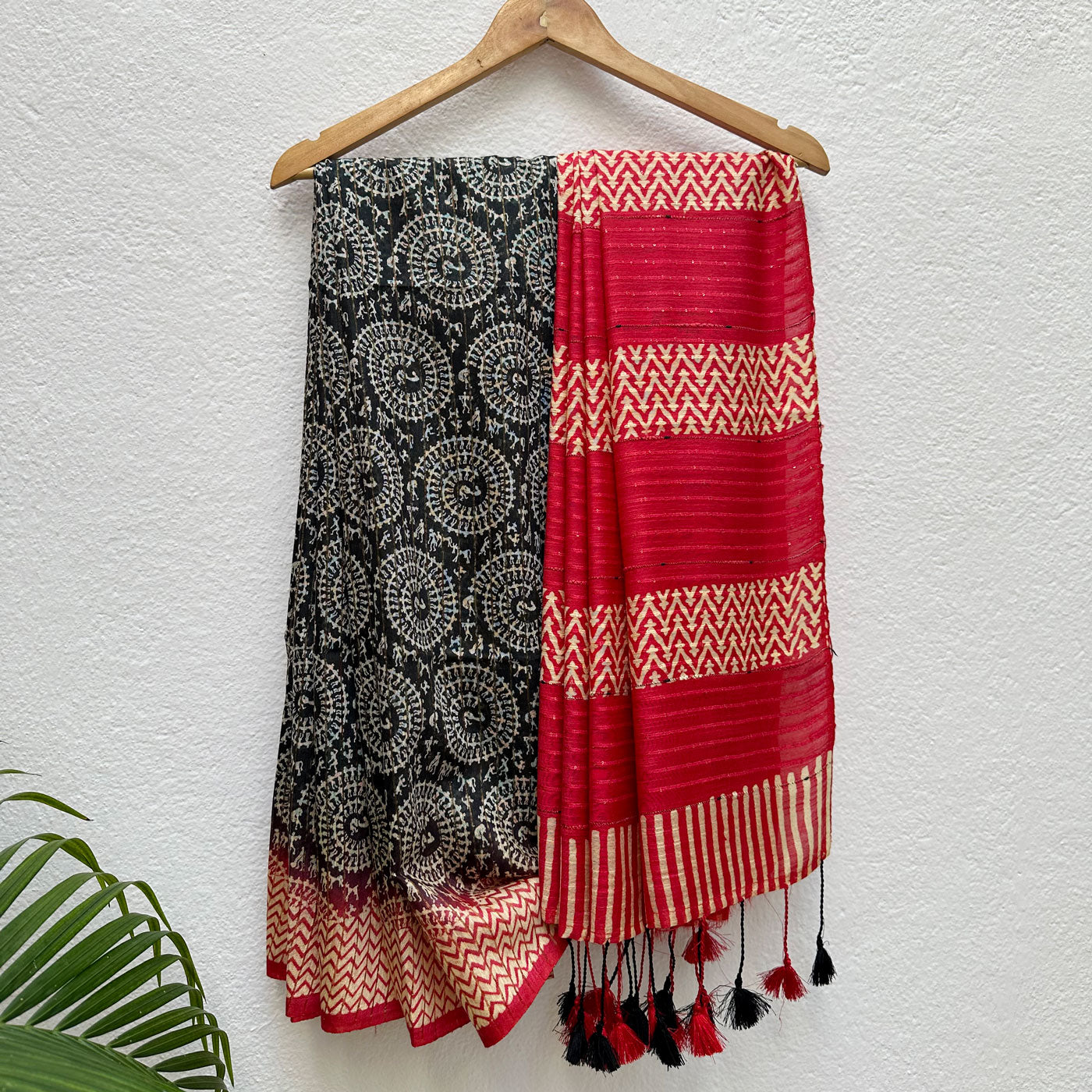 Transform your fashion with captivating tribal patterns, highlighted by a unique chevron edge and stunning tassels, accompanied by a remarkable chevron pallu adorned with sparkling sequins. Perfect for elegant events and polished get-togethers, radiating elegance and grace. Elevate your appearance with enduring adornments for a bold and stylish ensemble!