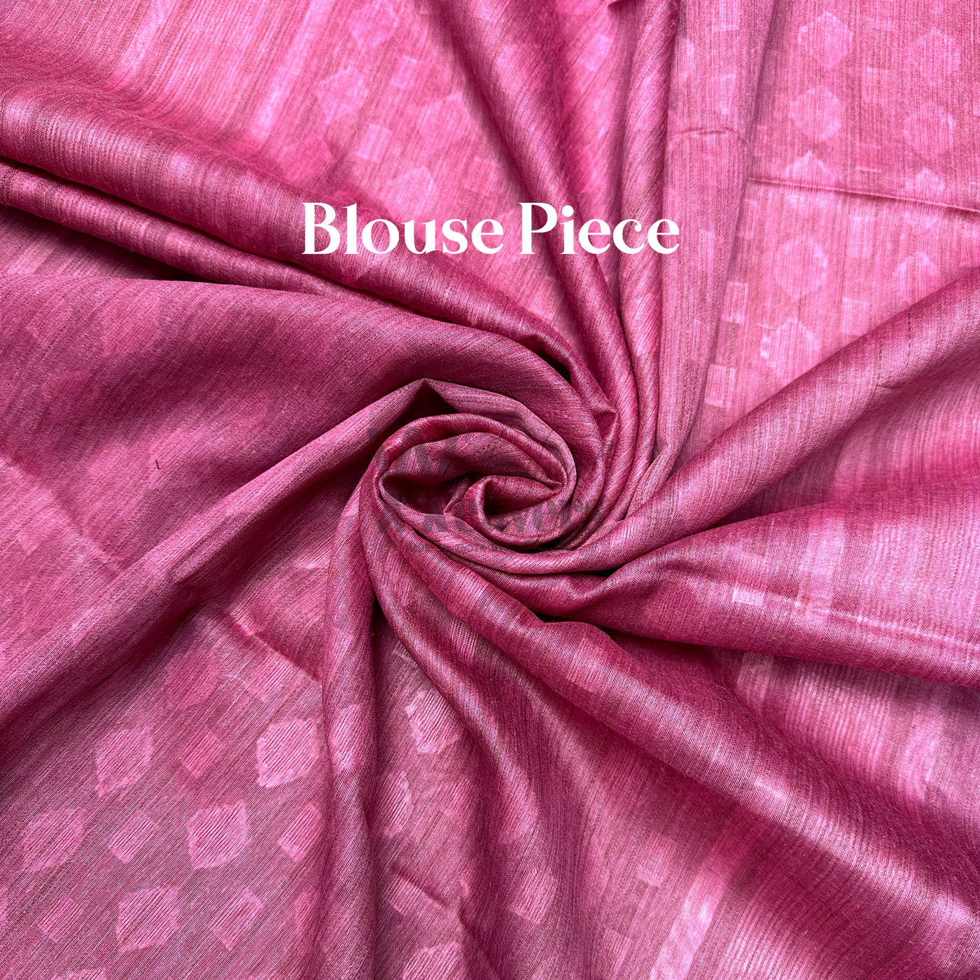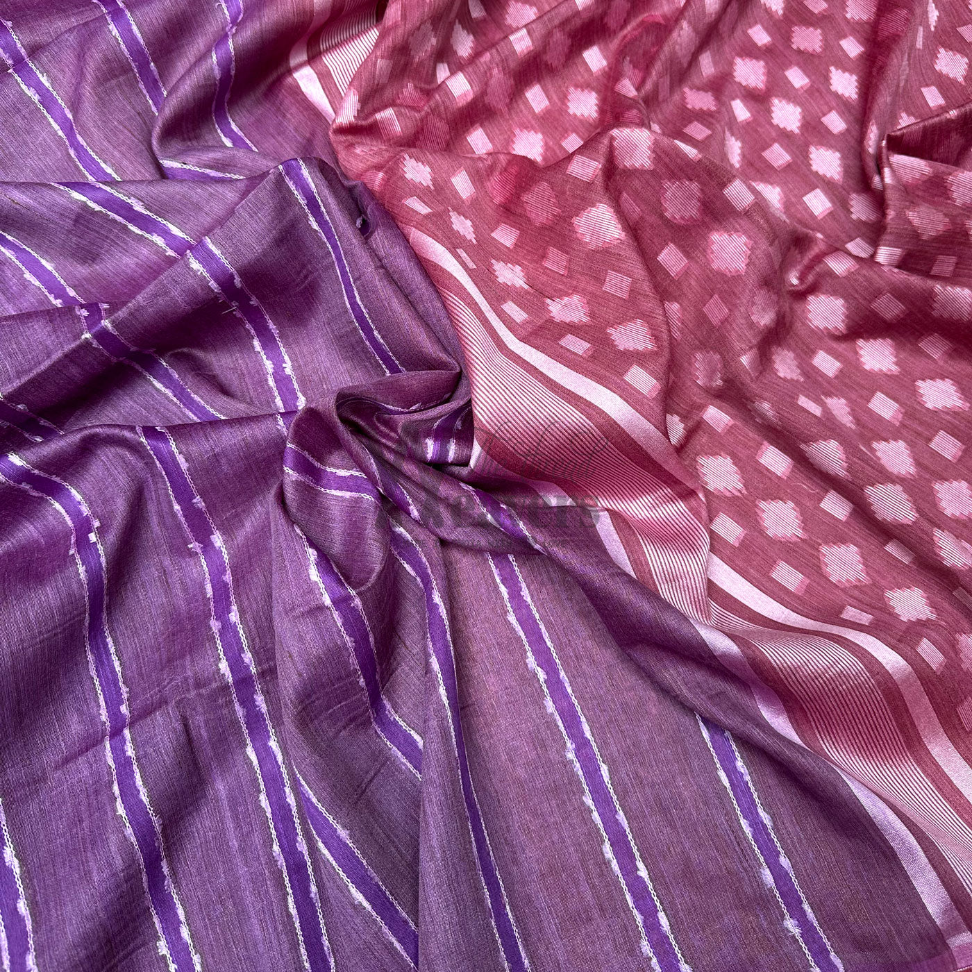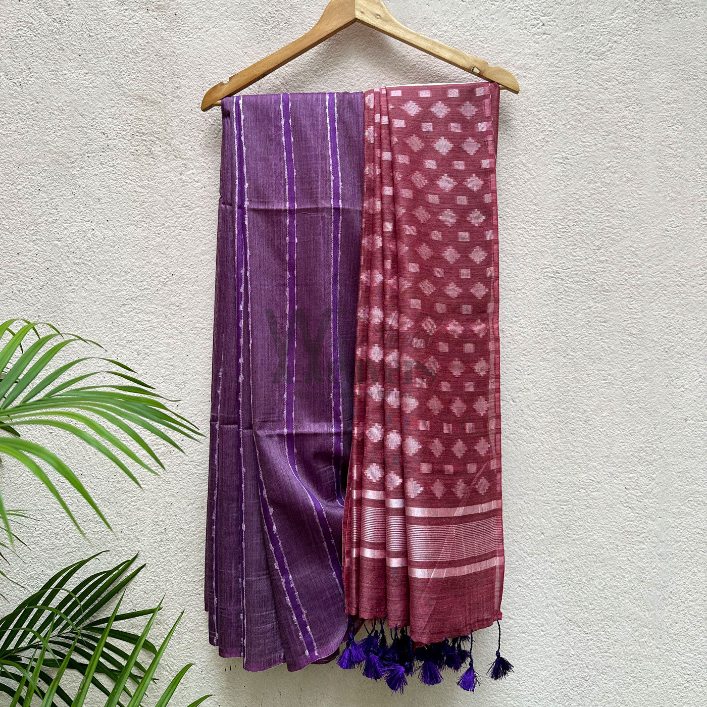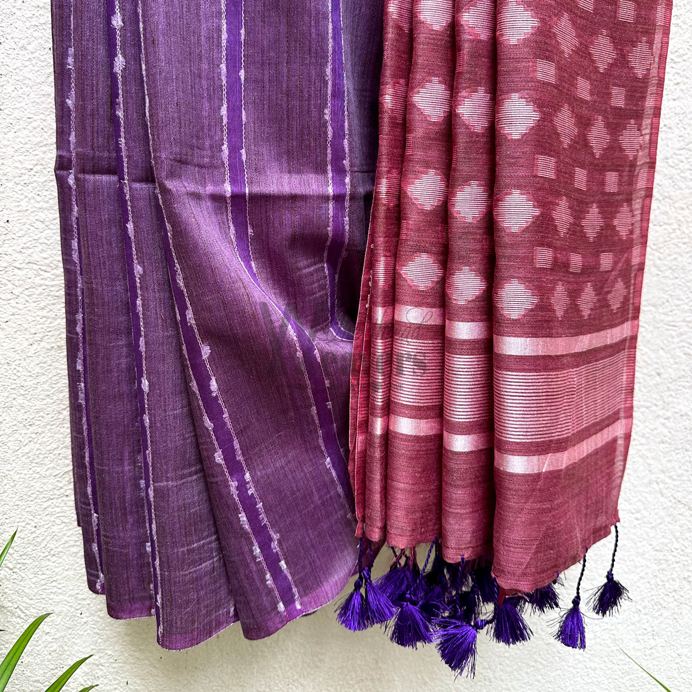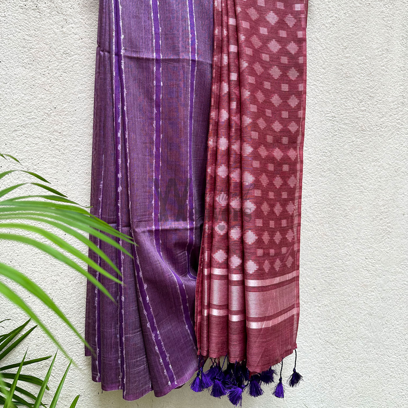 Elevate your style with the Cotton Bamboo Silk Saree in Sparkling Grape. This saree boasts a one-of-a-kind purple base and ghicha stripes, while the delightful dusky self design pink pallu features playful striped details and coordinating tassels. Let these tassels be a chic and stylish statement of your unique fashion sense.