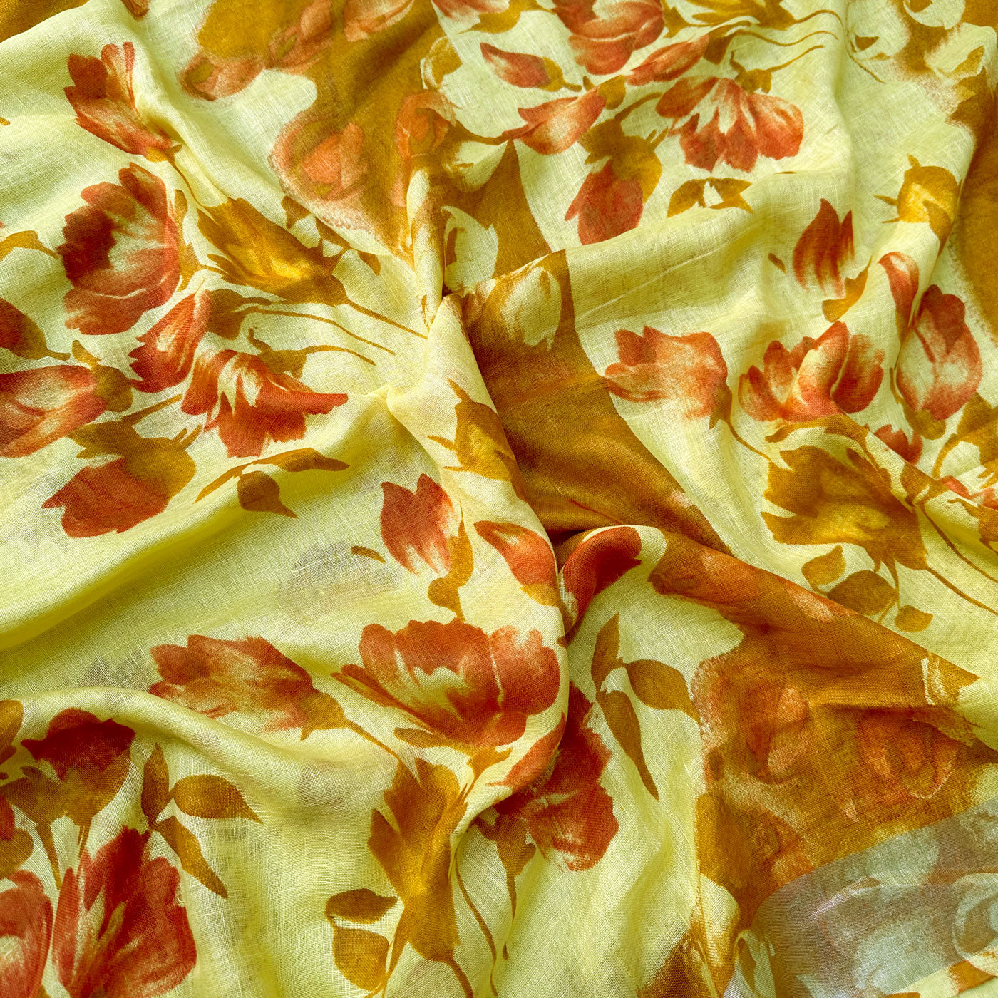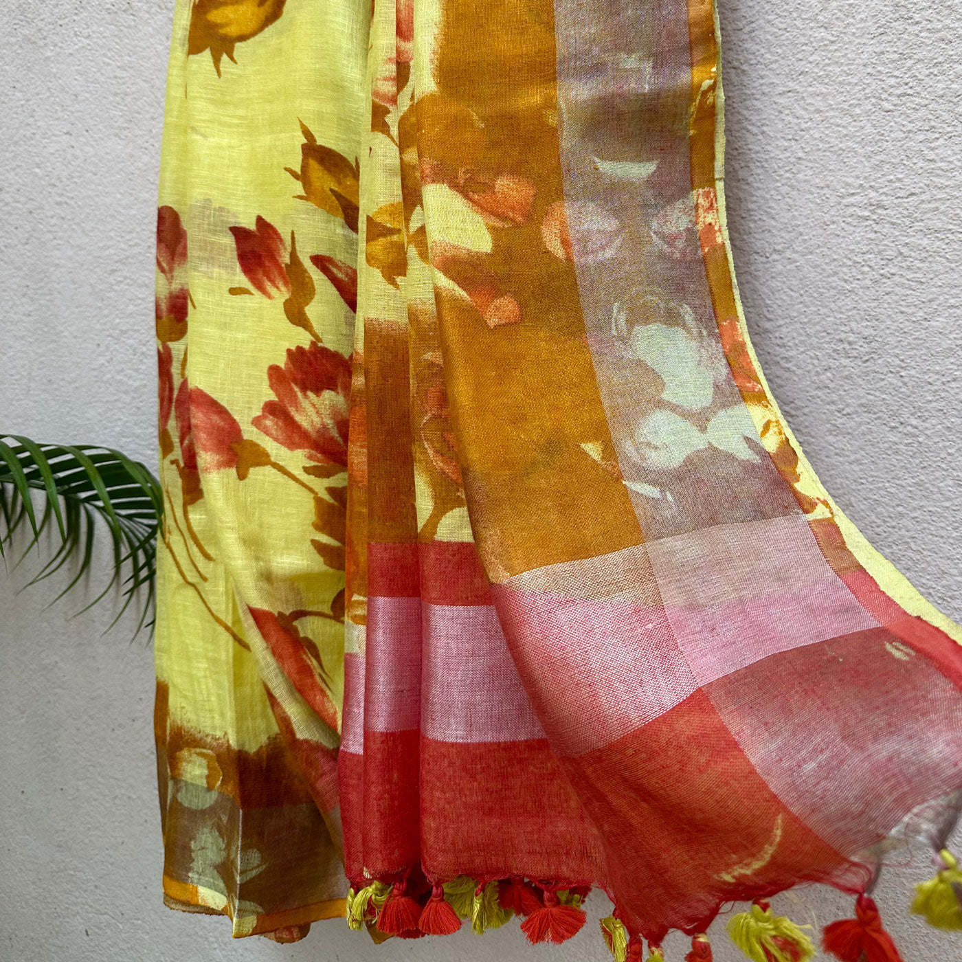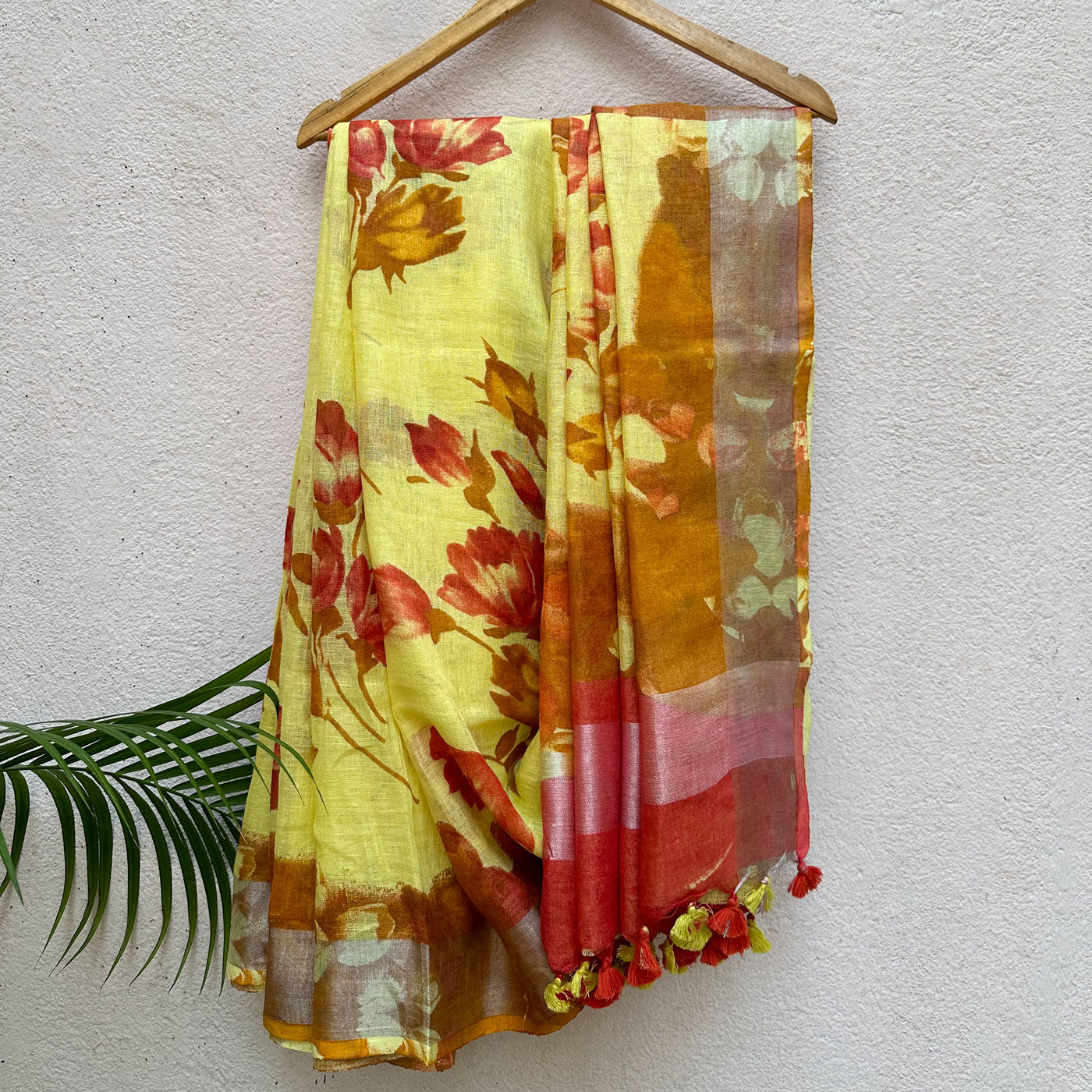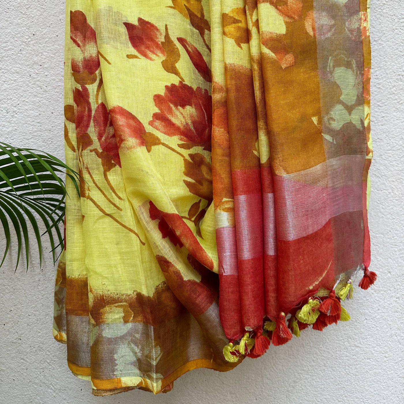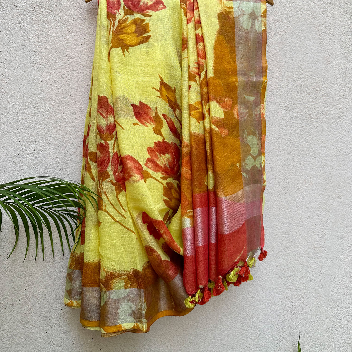 Discover the distinctive Stylish Spring Handblock Printed Pure Linen Saree from The Thread Weavers. The stunning border embellished with silver zari and a bold rust color creates a striking contrast. The body of the saree features digital looking floral prints, while the pallu showcases a vibrant dual-colored design with tassels and stripes, adding a touch of opulence to your ensemble.