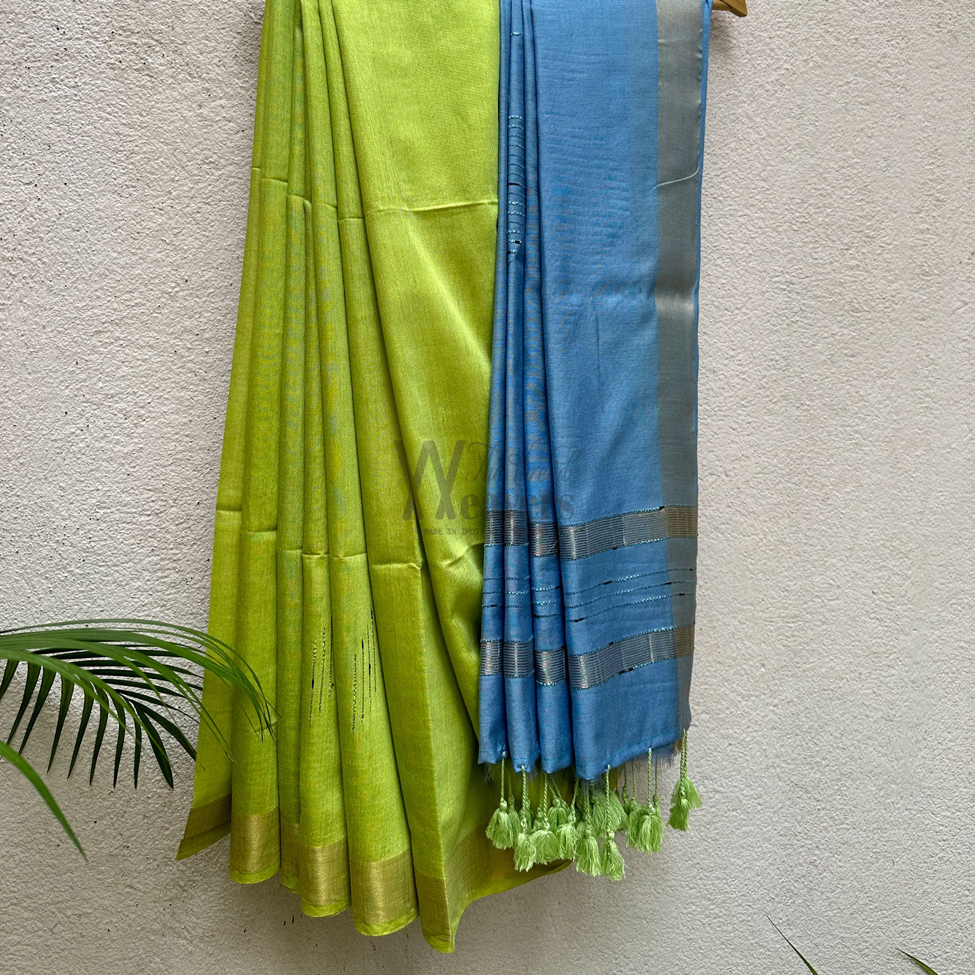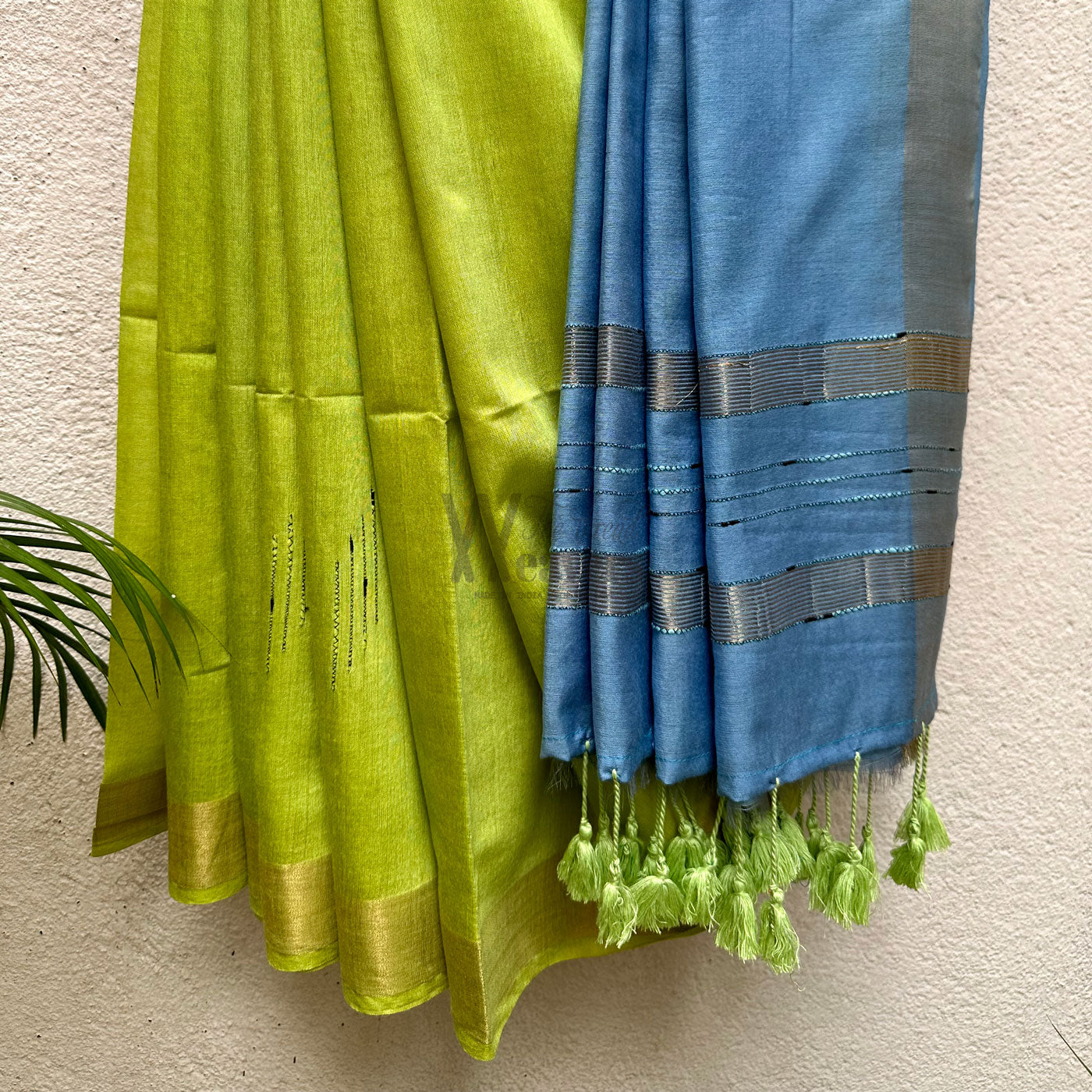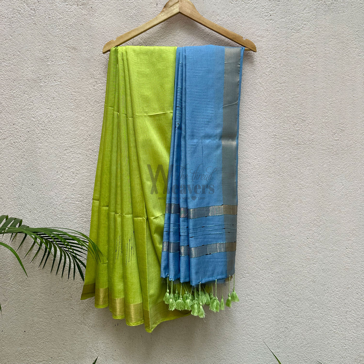 Elevate your style with our Sulphur Spring Cotton Viscose Saree! Boasting a two-toned design, gold zari border and pallu, and intricate handwoven buta motifs in fancy yarn, this ensemble is perfect for weddings and special occasions. Don't forget to flaunt the fringe-detailed pallu for a touch of sophistication. Upgrade your look this wedding season with our newest range of Sulphur Spring sarees made from a Cotton Viscose blend.