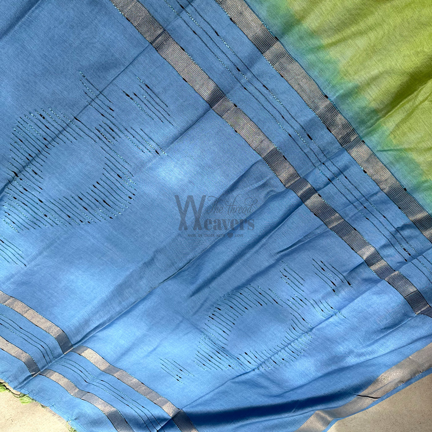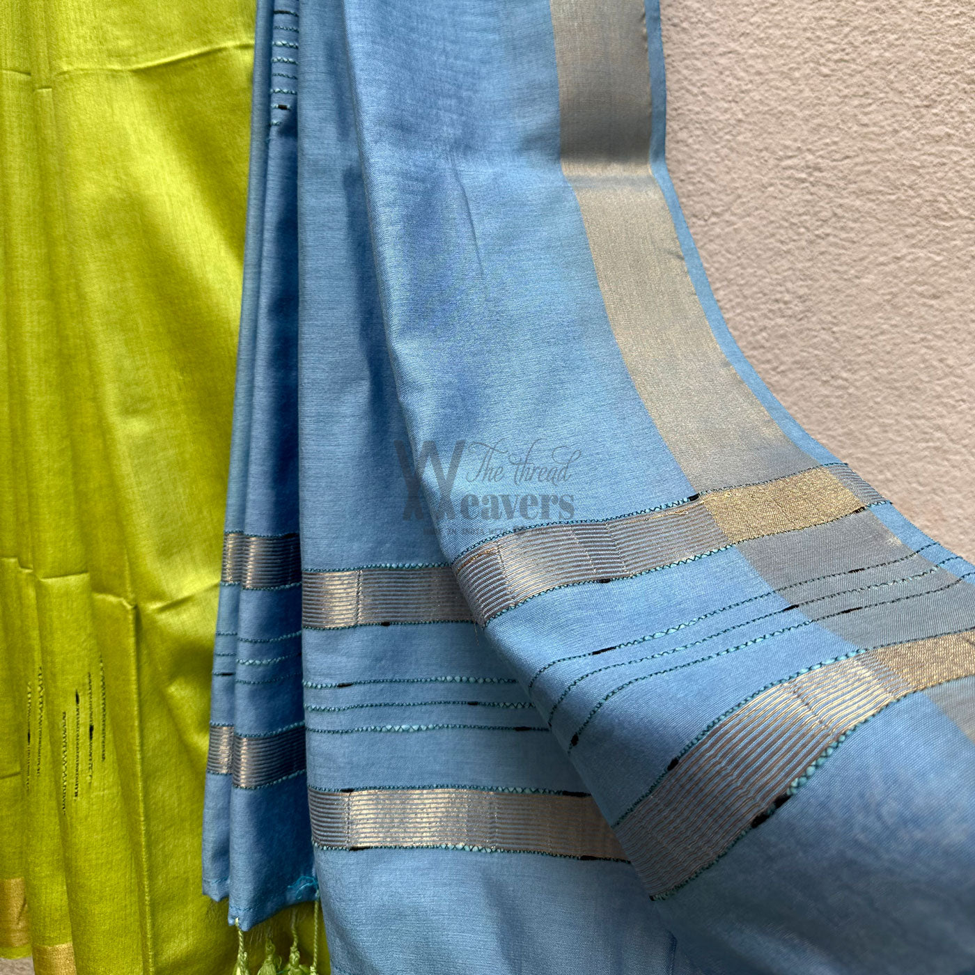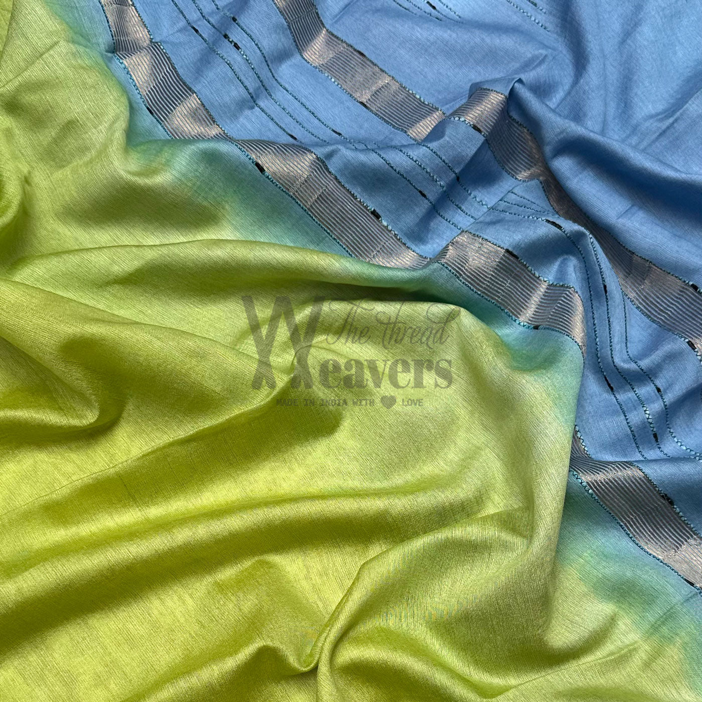 Elevate your style with our Sulphur Spring Cotton Viscose Saree! Boasting a two-toned design, gold zari border and pallu, and intricate handwoven buta motifs in fancy yarn, this ensemble is perfect for weddings and special occasions. Don't forget to flaunt the fringe-detailed pallu for a touch of sophistication. Upgrade your look this wedding season with our newest range of Sulphur Spring sarees made from a Cotton Viscose blend.