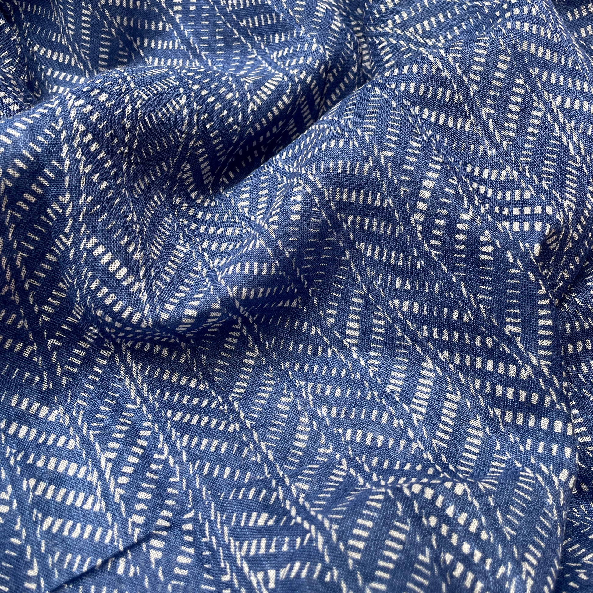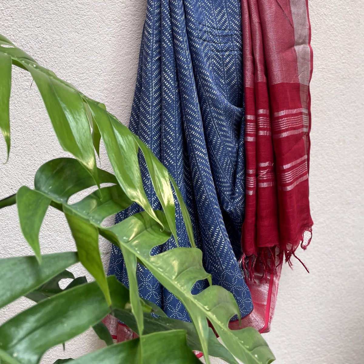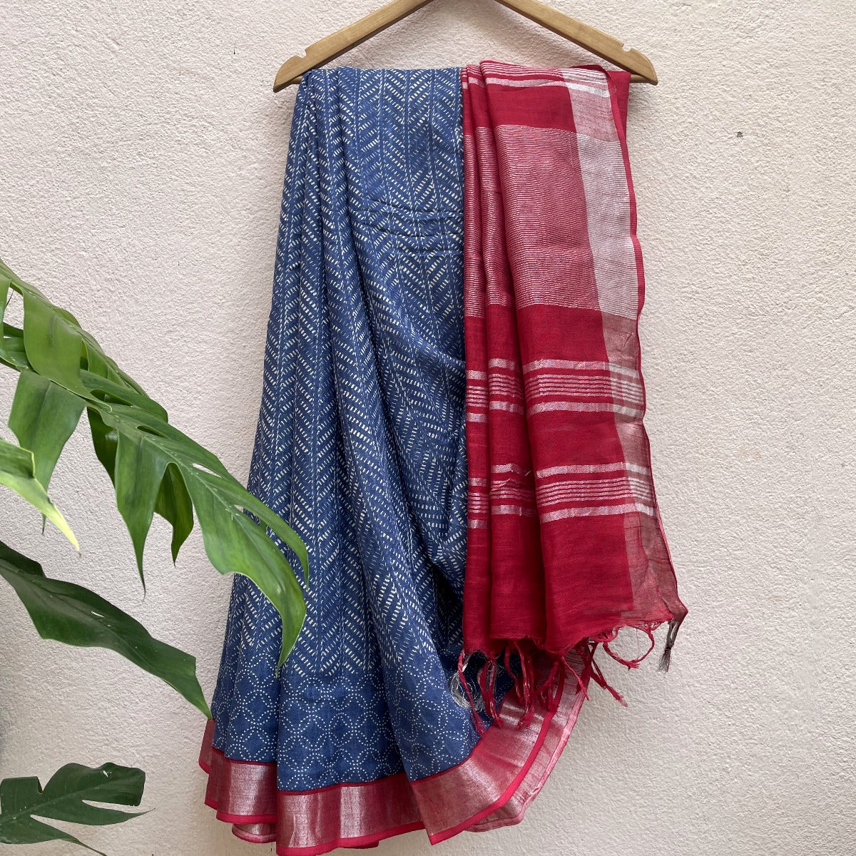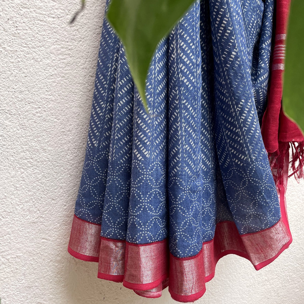 Show up in every single moment like you’re meant to be there. This admiral blue printed organic dual tone linen saree with red zari border and pallu inspires confidence every time you drape.