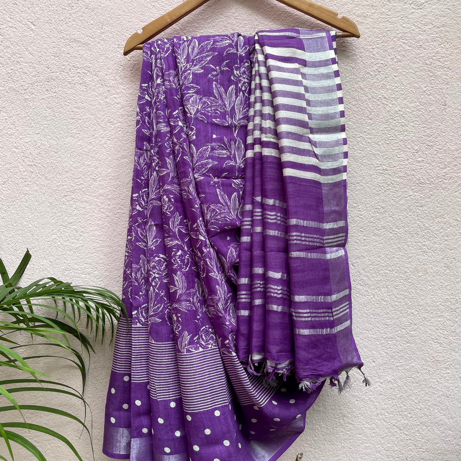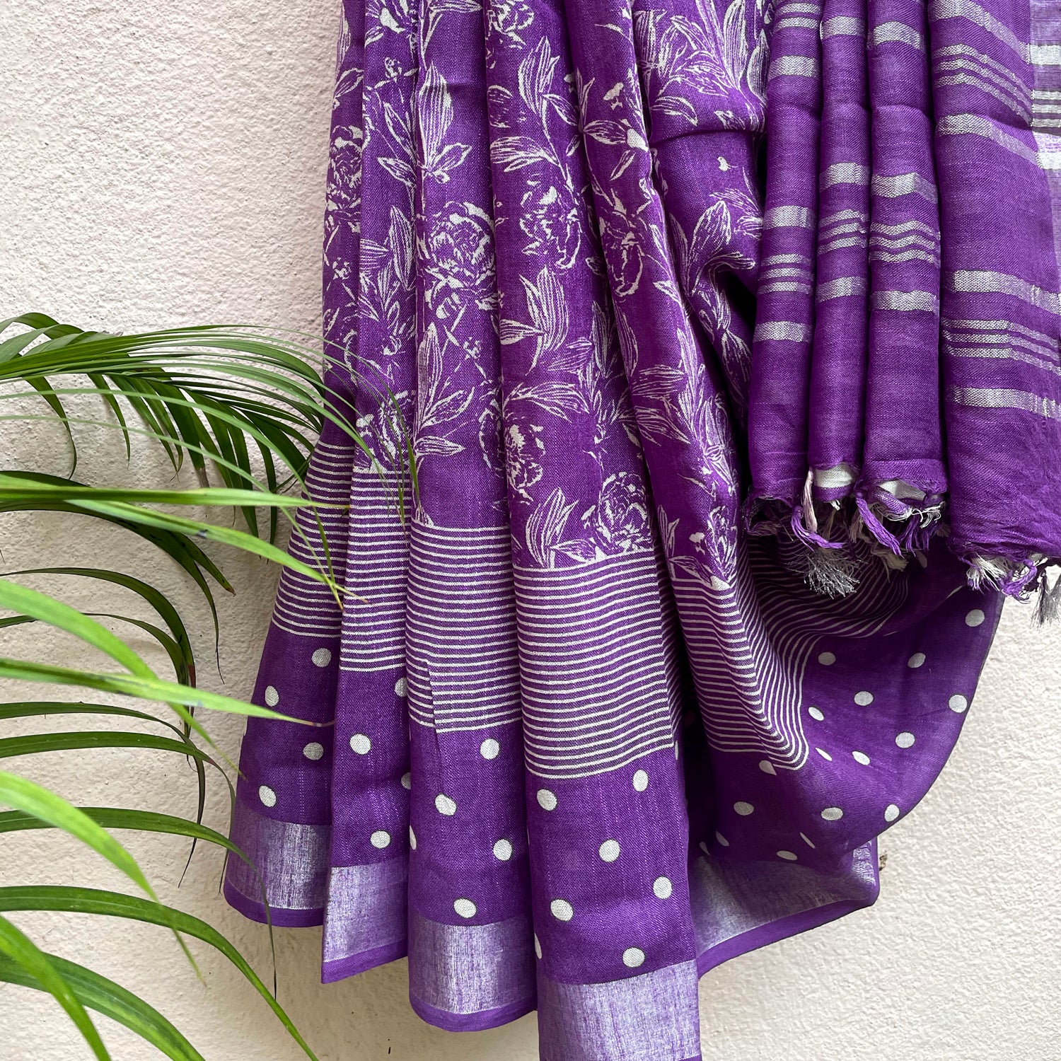 To simply put it, life is a beautiful melody, only the lyrics are messed up. Our Violet Meadow organic linen saree with floral print will up your fashion game. The silver zari border with a unique polka dotted border along with stripes will not only bring all the attention towards you but will make you stand out of the crowd. To top it all, it comes with a striped blouse for the fashionista in you.